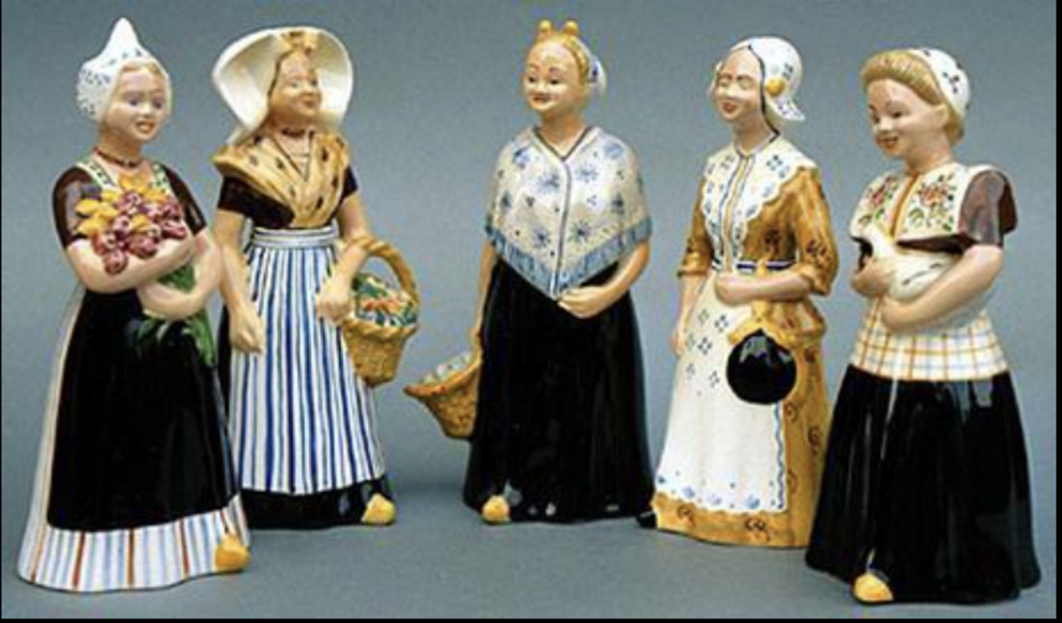 Spakenburgse vrouwen beschermen hun figuur met zwaar gesteven borstplaten die stijf en wijd op de schouders staan en bedekken hun haar met een wit gehaakt mutsje. Over de heup dragen ze drie rokken