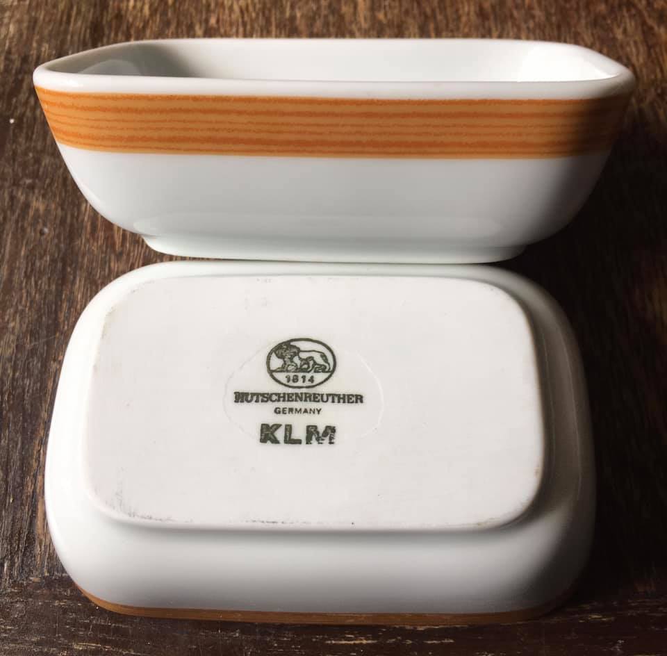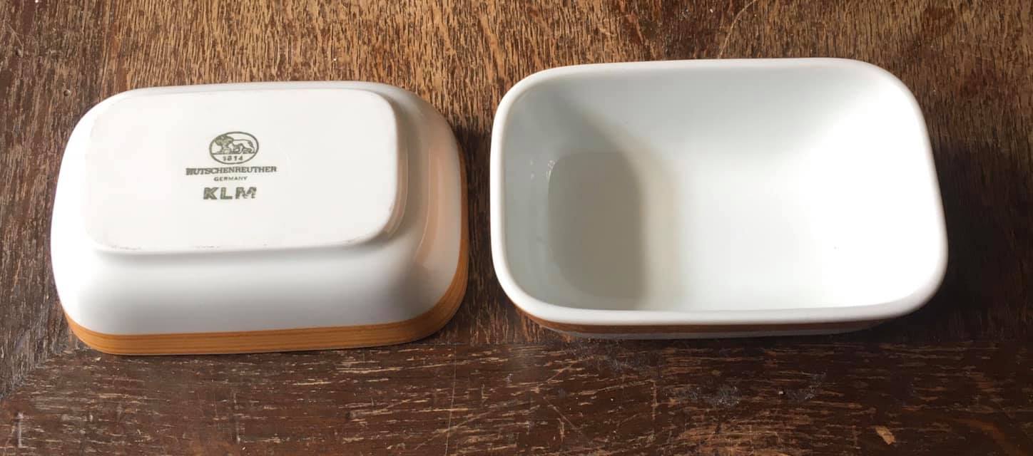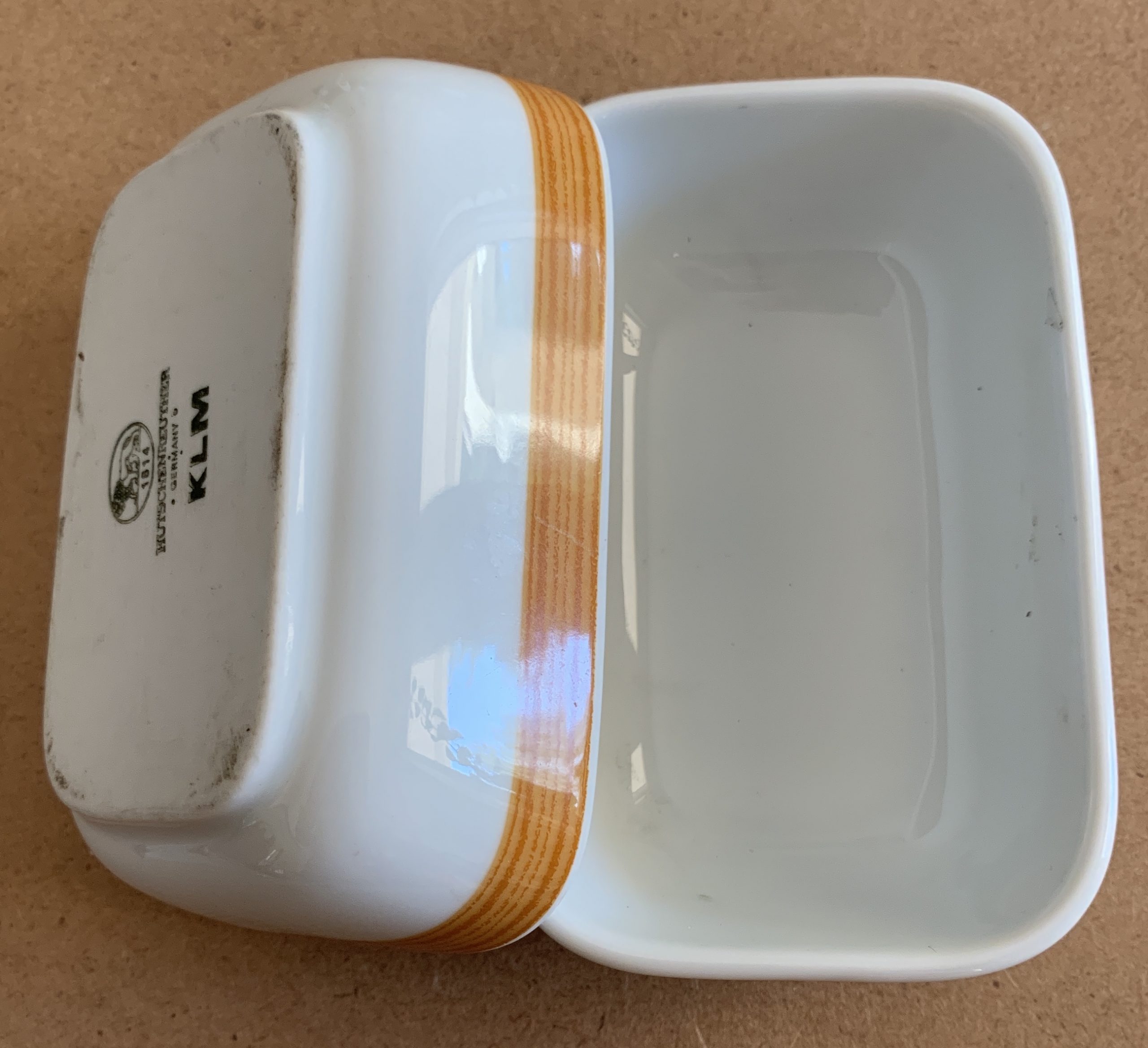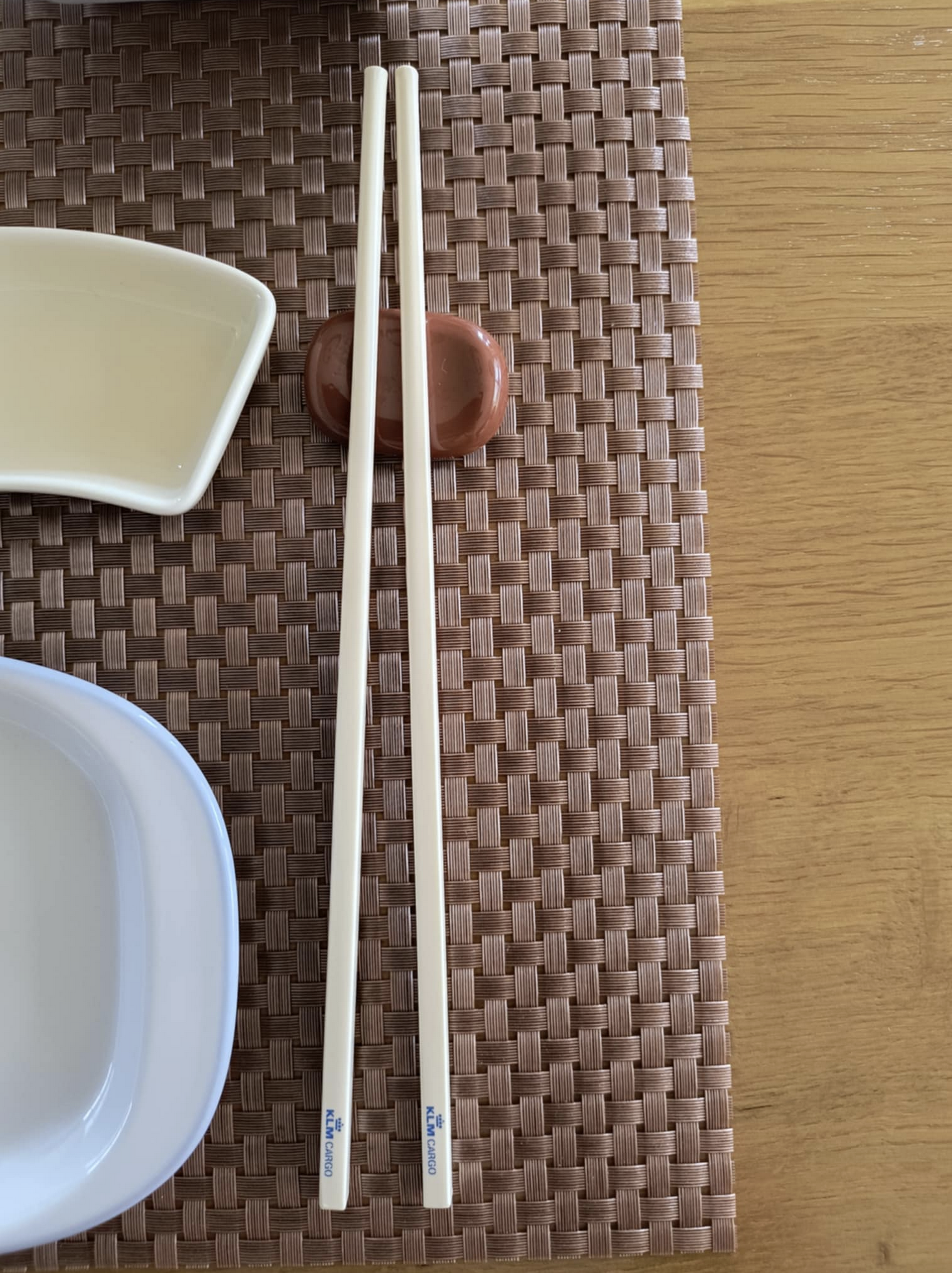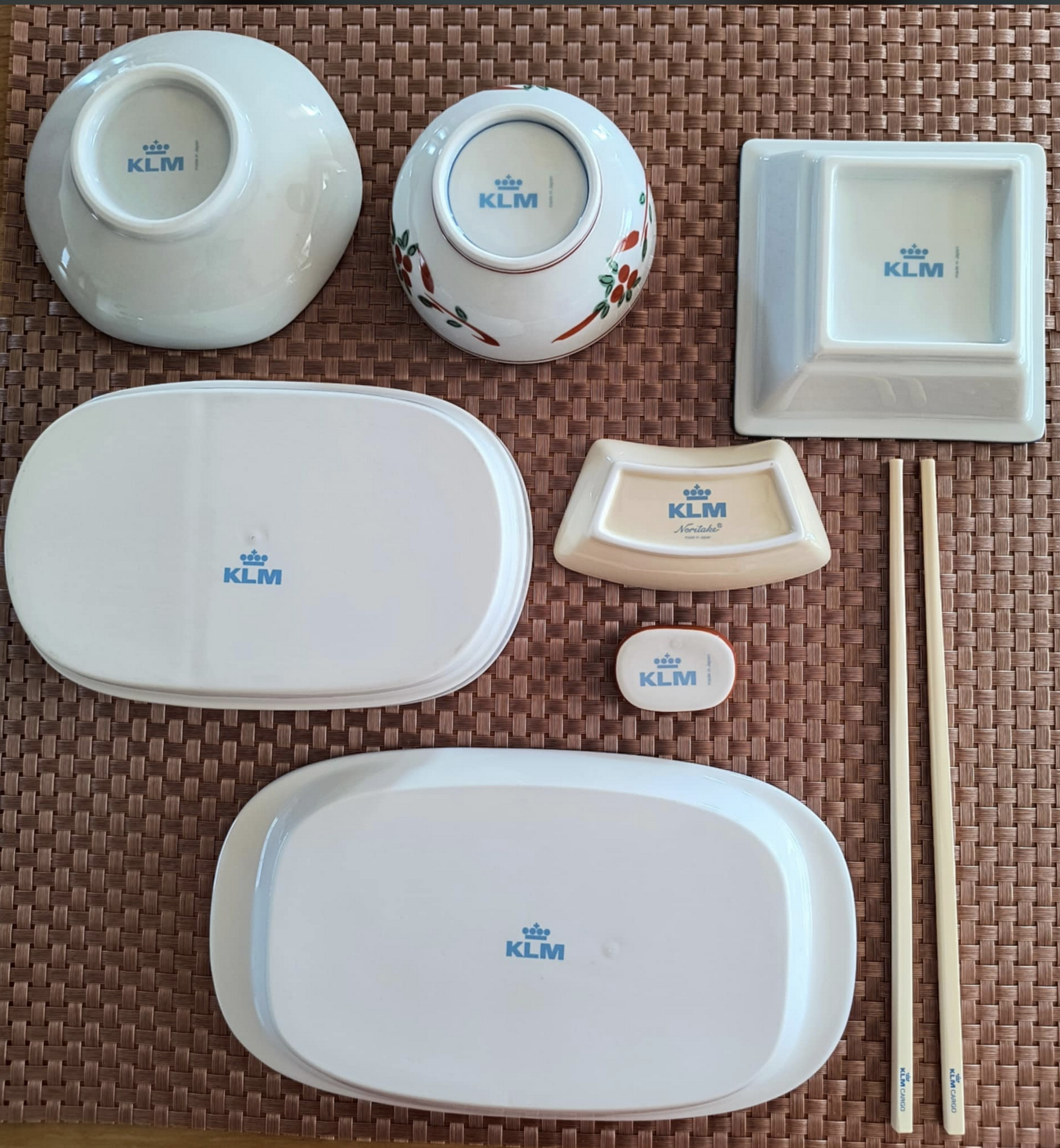 Compleet Aziatisch servies. Dit servies dat werd vroeger gebruikt bij de Route Dedicated Service (RDS) op Japan in de C Class. Kwam toen compleet uit met twee verschillende bordjes, vierkant schaaltje, soja saus schaaltje, klein bakje, miso bowl en copsticks met legger. foto’s ter beschikking gesteld door Letty van der Klugt-Ebes