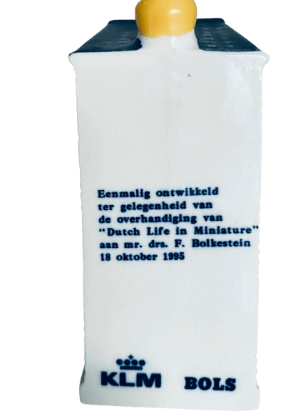 18-10-1995. Frits Bolkestein (4-4-1933 / 17-2-2025) die jarenlang commissaris is geweest bij de KLM was ook een hartstochtelijk verzamelaar van KLM-huisjes. Hij is de enige persoon voor wie KLM in 1995 exclusief een eigen huisje heeft gemaakt, in een oplage van 5 stuks. Het is een replica van zijn voormalige woonhuis op de Cornelis Schuytstraat 50 in Amsterdam.