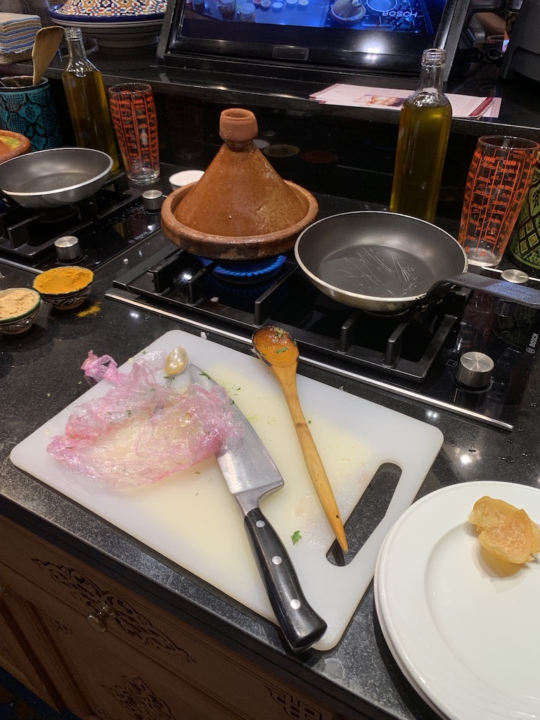 De kookgelegenheid een prachtige ruimte. Iedereen heeft zijn eigen werkplek, twee gaspitten, een koekenpan en Tajine, keukengereedschap, wasbak, kraan, specerijen en een monitor. Het werd door de cheffin vertelt maar aan het eind van de ruimte was ook een kokkin bezig en volgde de aanwijzingen van de cheffin. Haar activiteiten konden we ook volgen op een groot scherm voor ons. Soms wel handig want de opmerking: we gaan nu de paprika van zijn jasje ontdoen landde bij mij niet. De beelden gaven gelukkig uitkomst. Ging ook redelijk gemakkelijk want die hadden vooraf in de oven gelegen.