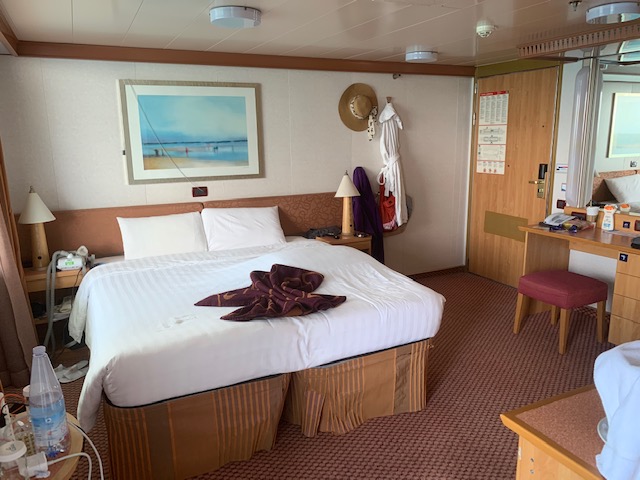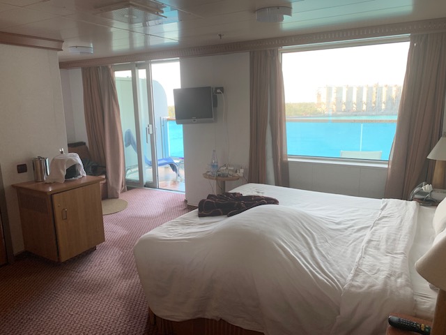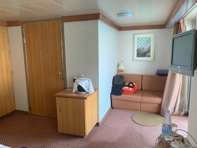 Eindelijk, na enkele uren werden we omgeroepen of we ons aan de balie wilden melden. Daar hadden ze goed nieuws voor ons. We kregen een andere hut, geschikt voor rolstoelgebruiker en ook, zoals we hadden besteld, met balkon. We moesten nog wel even geduld hebben maar het zou goed komen.