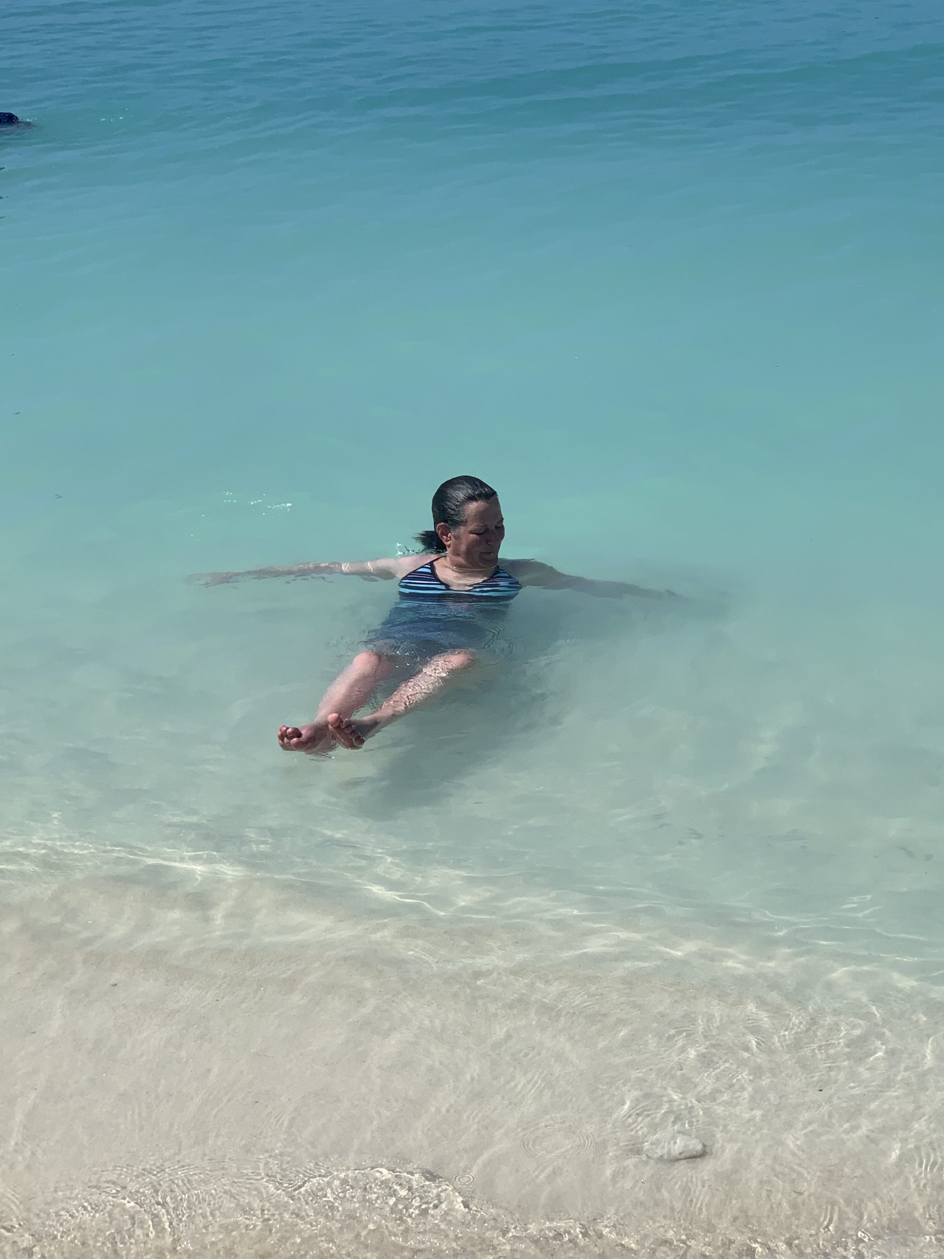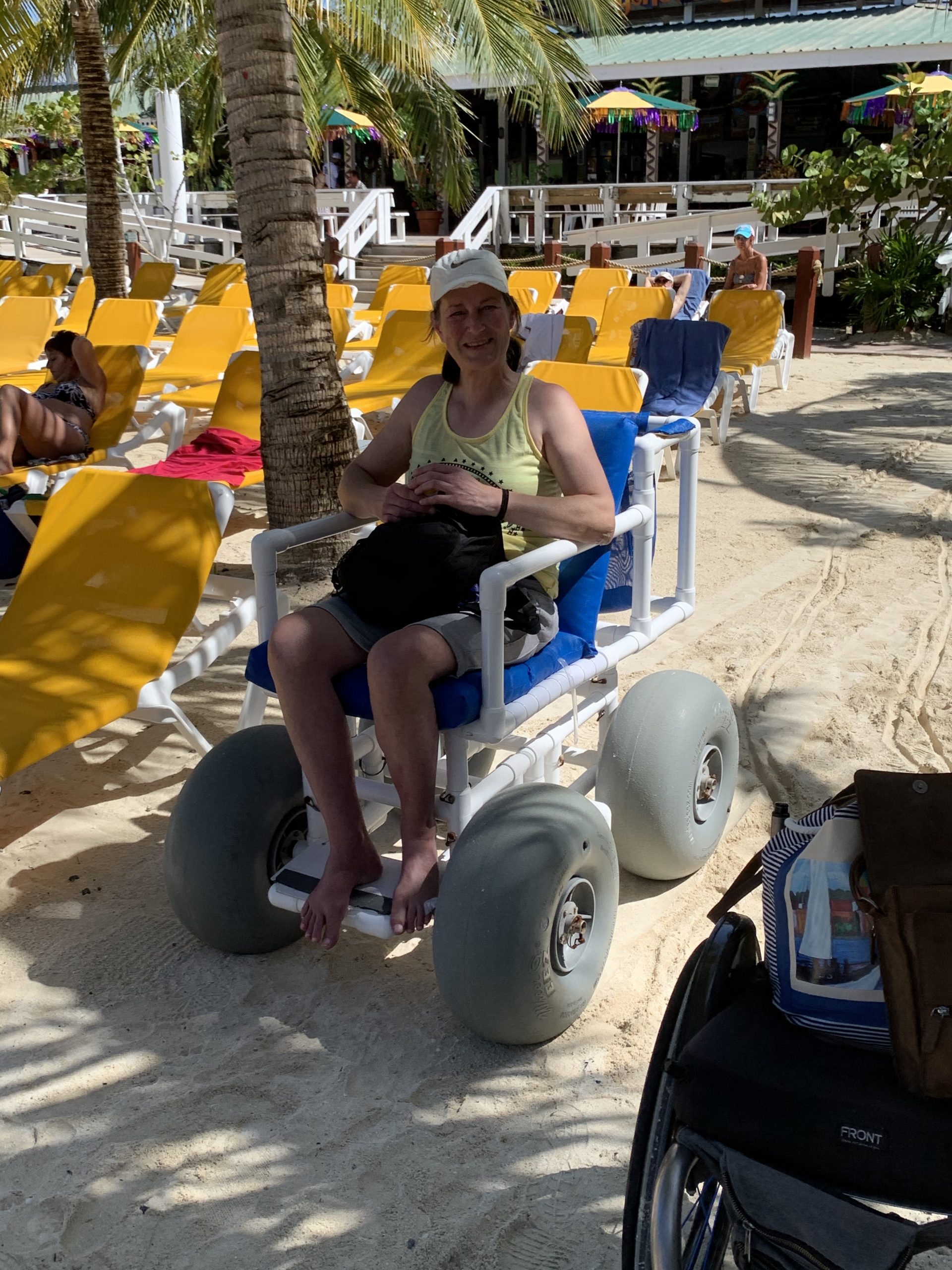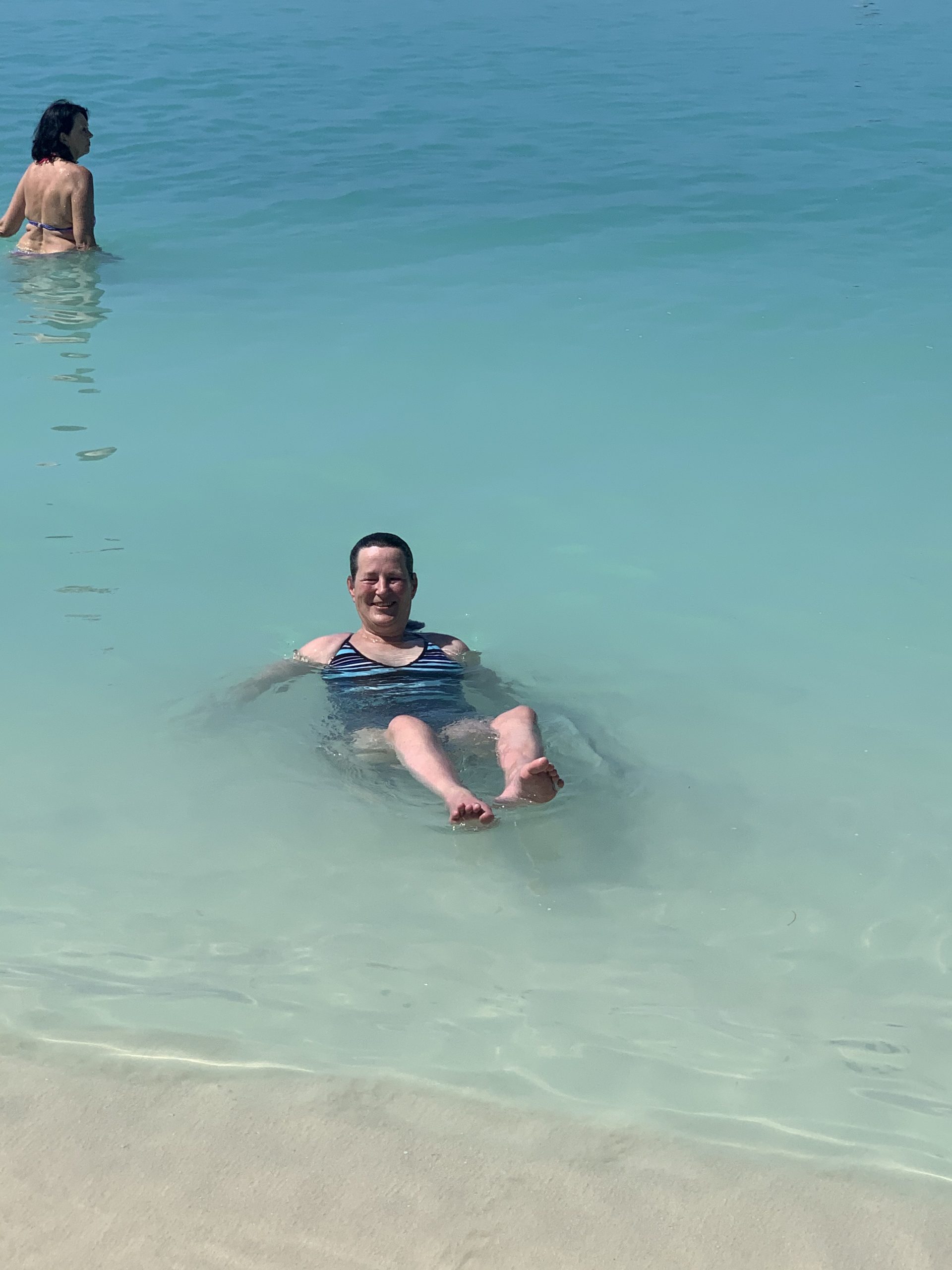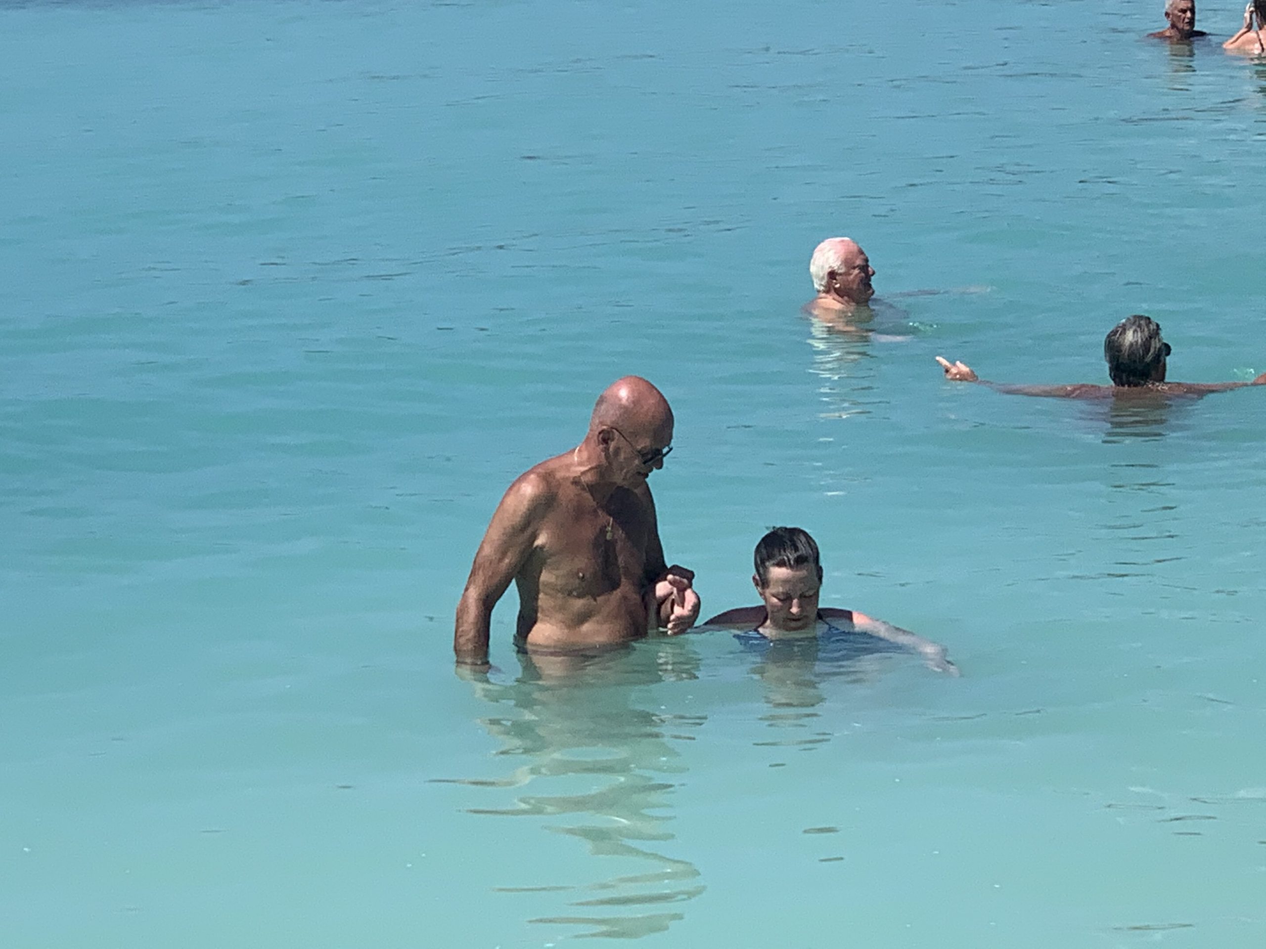 Haar benen bleven drijven en ze ging natuurlijk steeds verder. Een echtpaar uit Nederland waar zij op de boot al een paar keer contact mee had gehad, wilde haar wel helpen. Aan de arm van de man ging ze steeds verder de zee in. Het was voor haar HET moment van de vakantie. Het was ruim 20 jaar geleden dat ze in zee had gelegen. Uiteindelijk moest ze er toch uit. Twee mannen hebben haar in de rolstoel geholpen en toen was het richting de douches. Dat was niet zo’n geschikte plaats voor iemand in een rolstoel dus dan maar afspoelen met de tuinslang. Zelfs dat was grote pret.