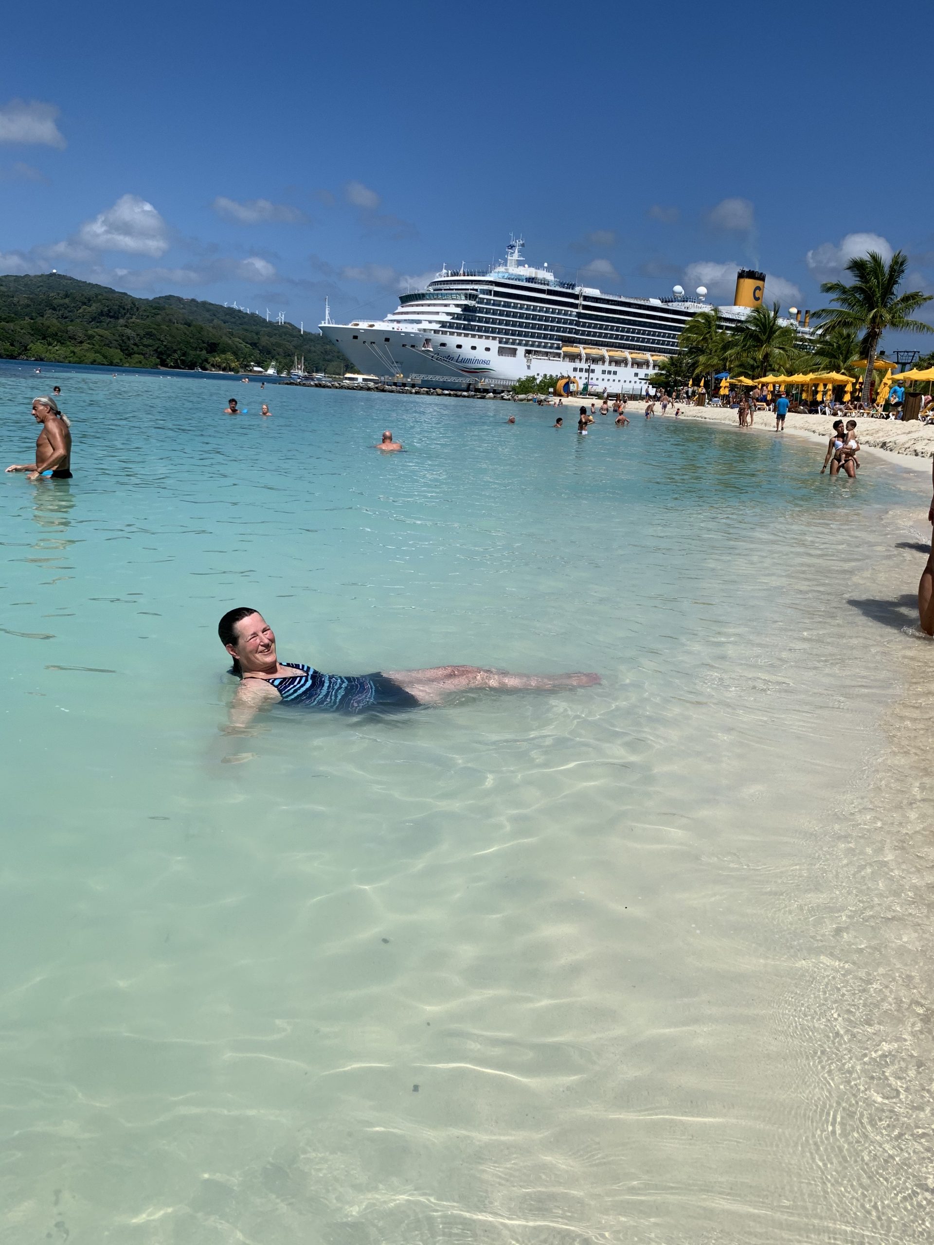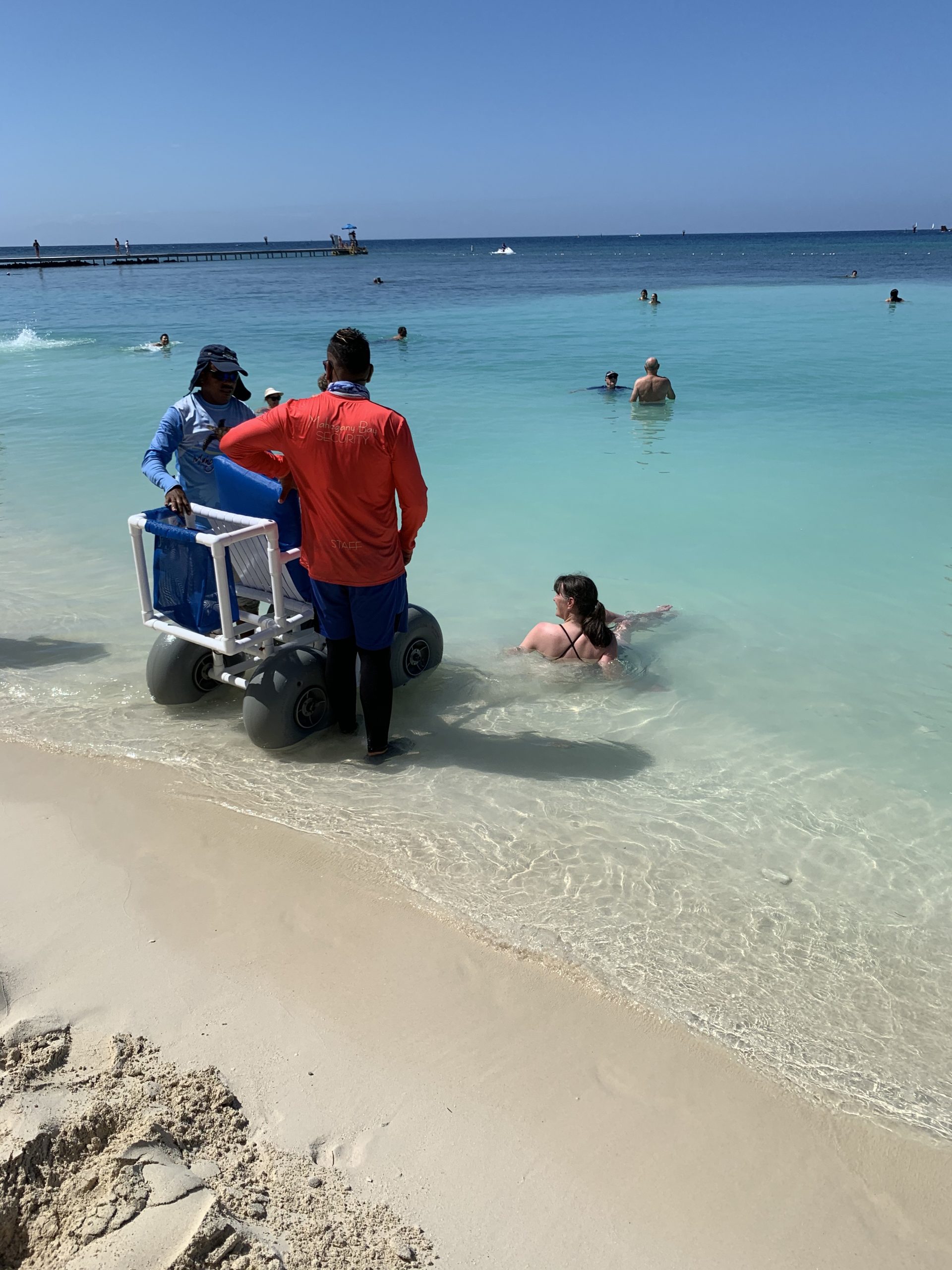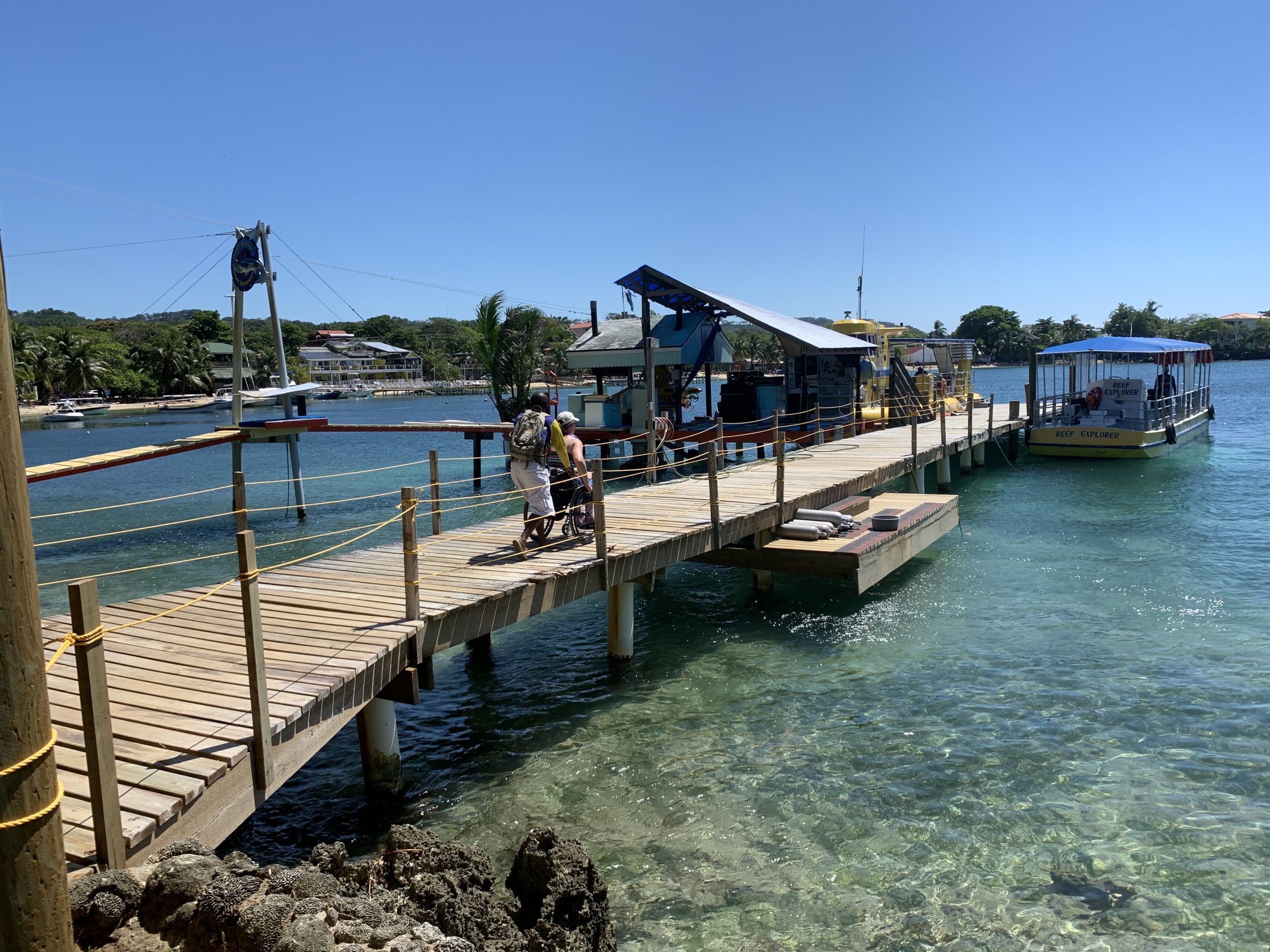 Vandaag was Latijns Amerika aan de beurt en dan met name Honduras. We legden aan bij het eiland Roatán. Dat is het grootste eiland van de Baai-eilanden, een eilandengroep voor de kust van Honduras. Het was al vroeg warm. Een grote wens van Lindy was om te gaan zwemmen. Na een paar keer nee gehoord te hebben hadden we eindelijk beet. Ze hadden een rolstoel met van die grote dikke wielen waar je mee door het zand kunt rijden.