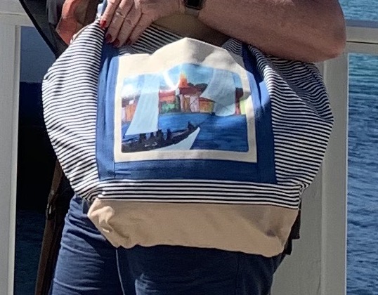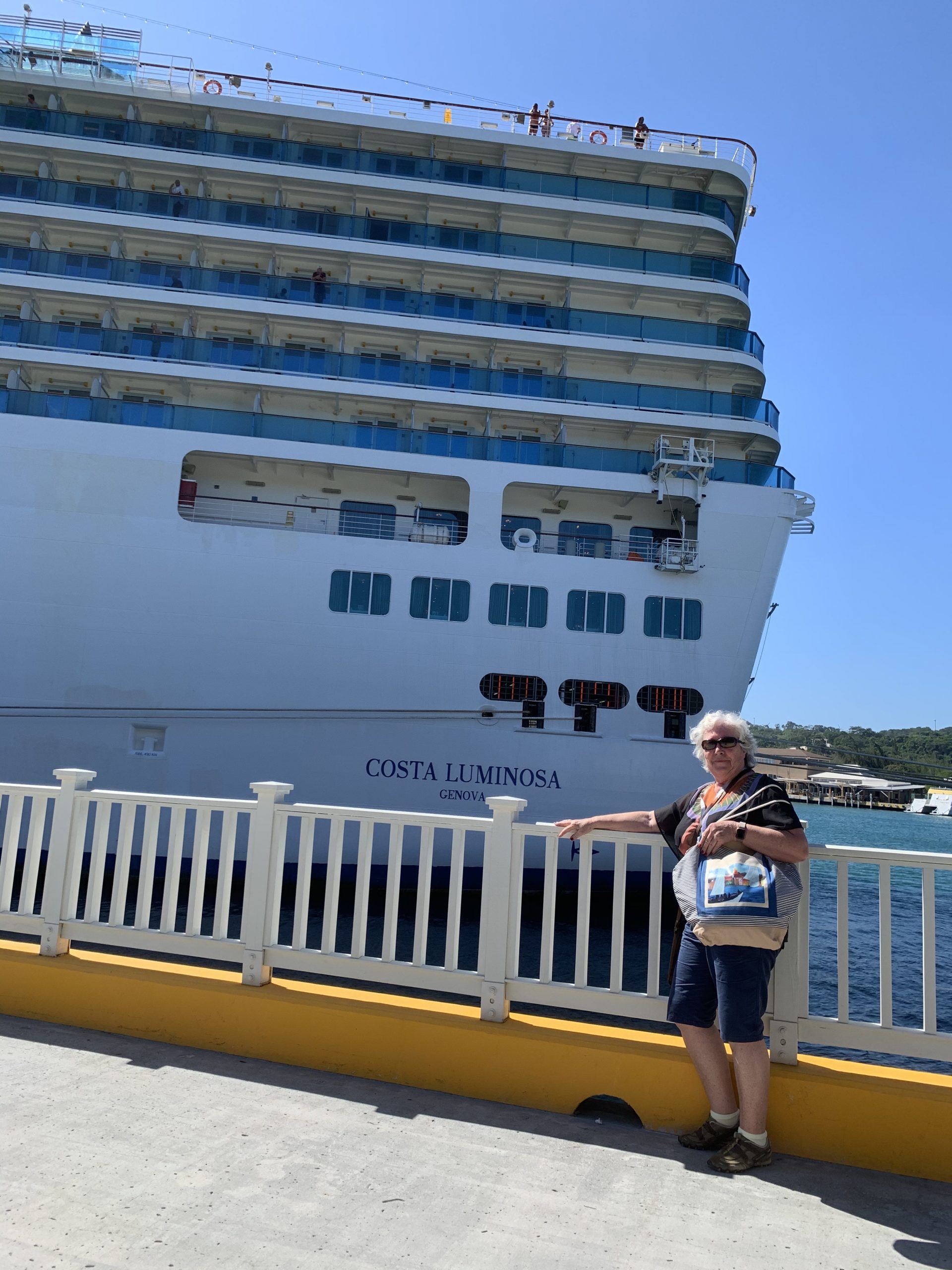 Toen we in de haven waren heeft Lindy nog een foto van me gemaakt met op de achtergrond ons schip en ik met mijn mooie strandtas, gemaakt door een vriendin uit Frankrijk met gouden handjes. Een echte Roosenthaler.