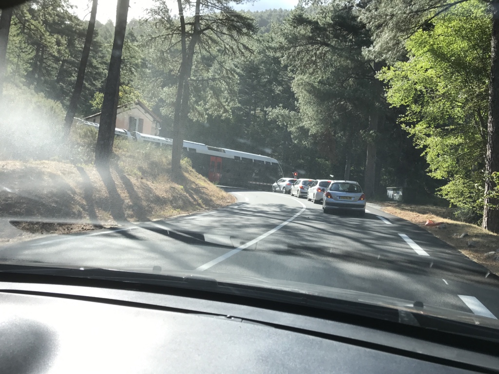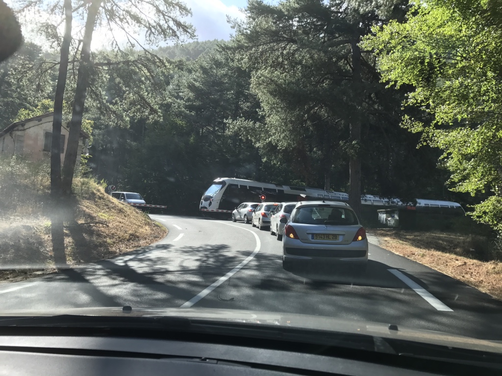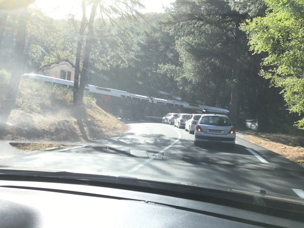 Wij terug naar de balie en ons geld teruggevraagd. Was geen enkel probleem. Daarna naar de apotheek om pillen te halen voor beginnende blaasontstekingen de kop in te drukken en toen naar de auto. We laten ons natuurlijk niet kisten door de SNCF dan gaan we gewoon met de auto. Een half uurtje later, na een korte WP van Alexandra moesten we stoppen bij een overweg en jawel daar ging ons treintje. Iedereen als haring in een ton en wij lekker comfortabel in de auto.