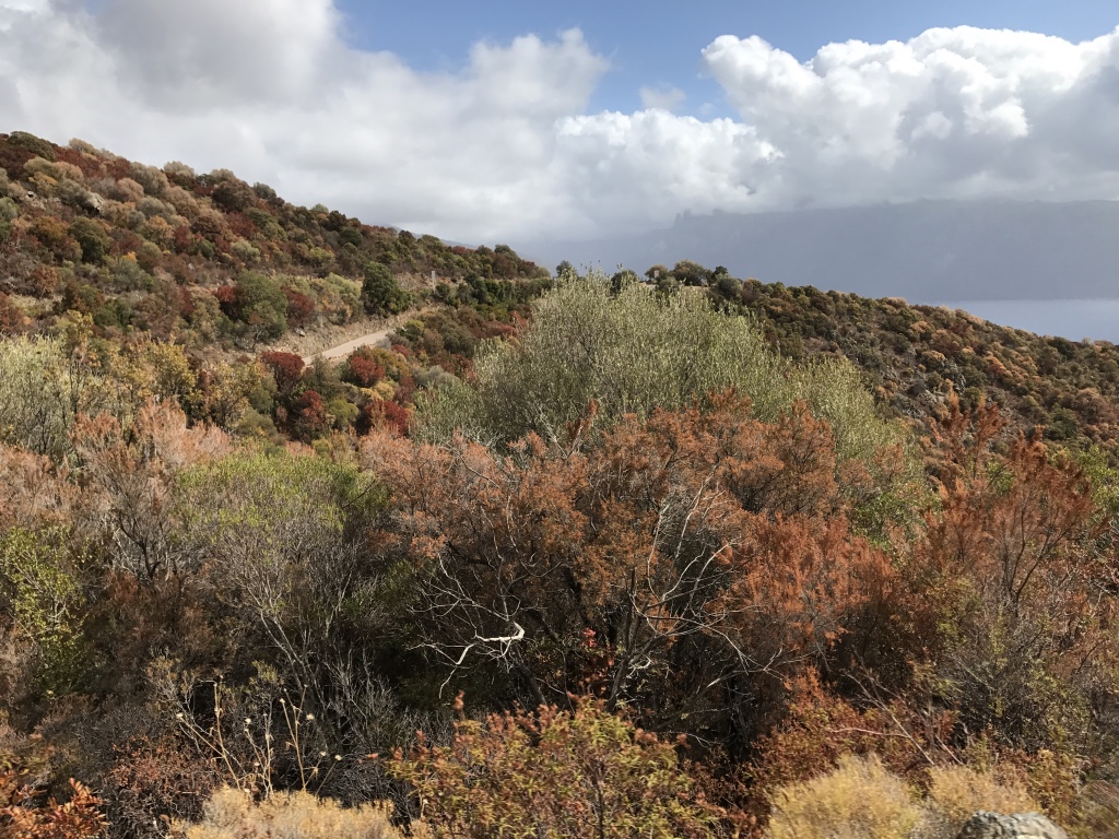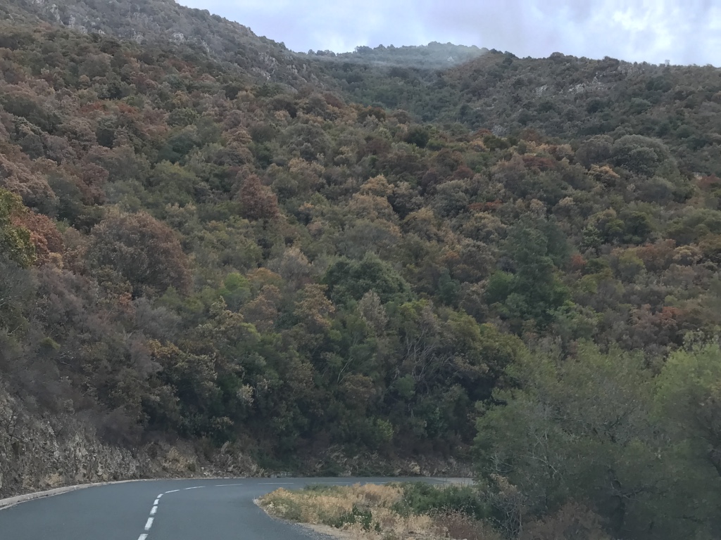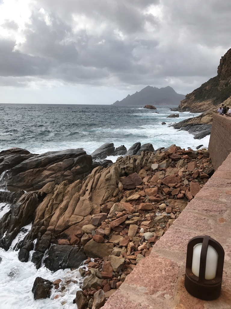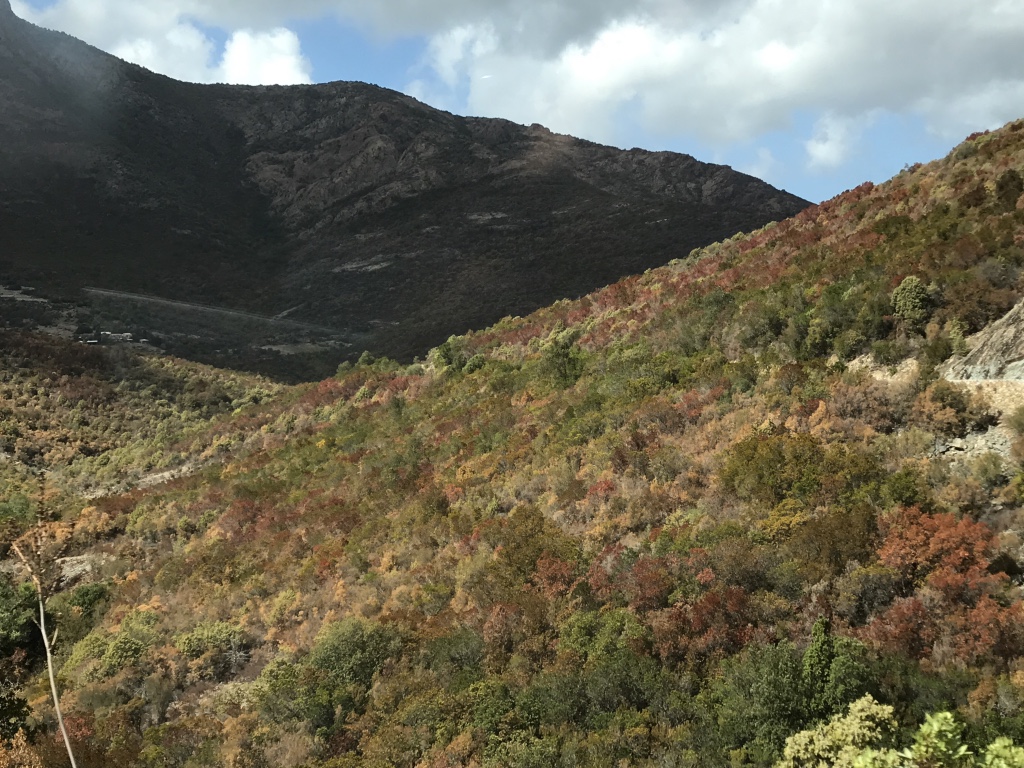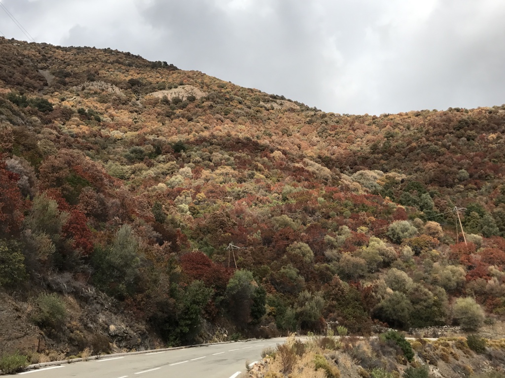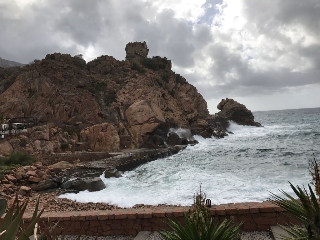 Het water was lekker ruig en daar een paar mooie foto’s van gemaakt. Aan de haven geluncht en wat rond gelopen en daarna weer de kustlijn verder gevolgd via Calenzana, Galéria, Osani, Curzo, Pattinello naar Porto. Dat was het mooiste dorp dat we hebben gezien. Het schiereiland Scandola behoort tot de World Heritage Site van Unesco Werelderfgoed. Deze prachtige rotsmassa ligt tussen de Golfe de Galeria en de Golfe de Girolata in. De prachtige rode kliffen, grotten en de bijzondere flora en fauna zijn uitzonderlijk. Alles was hier al getooid in de schitterende kleuren van de Indian Summer.
