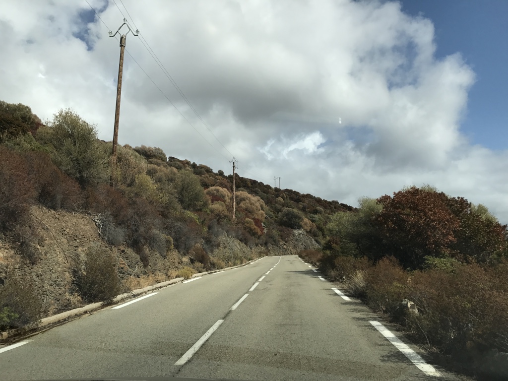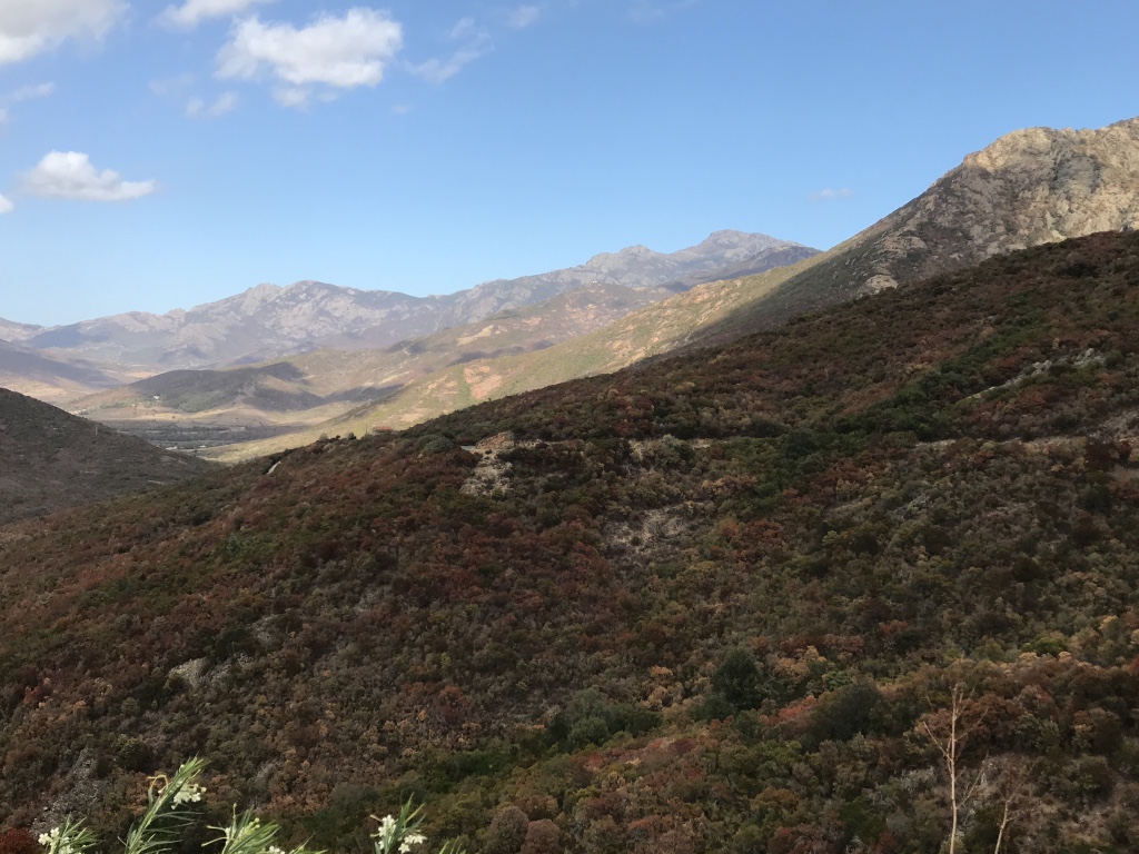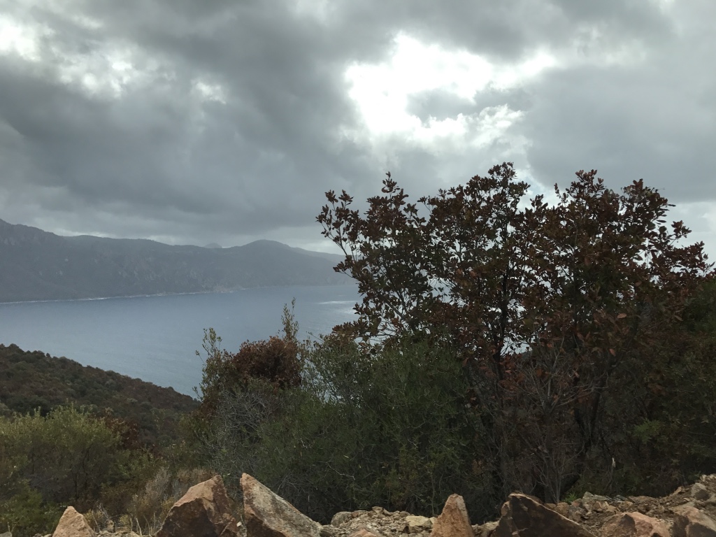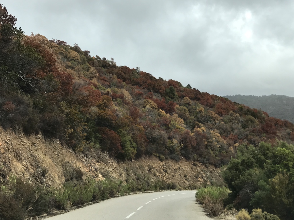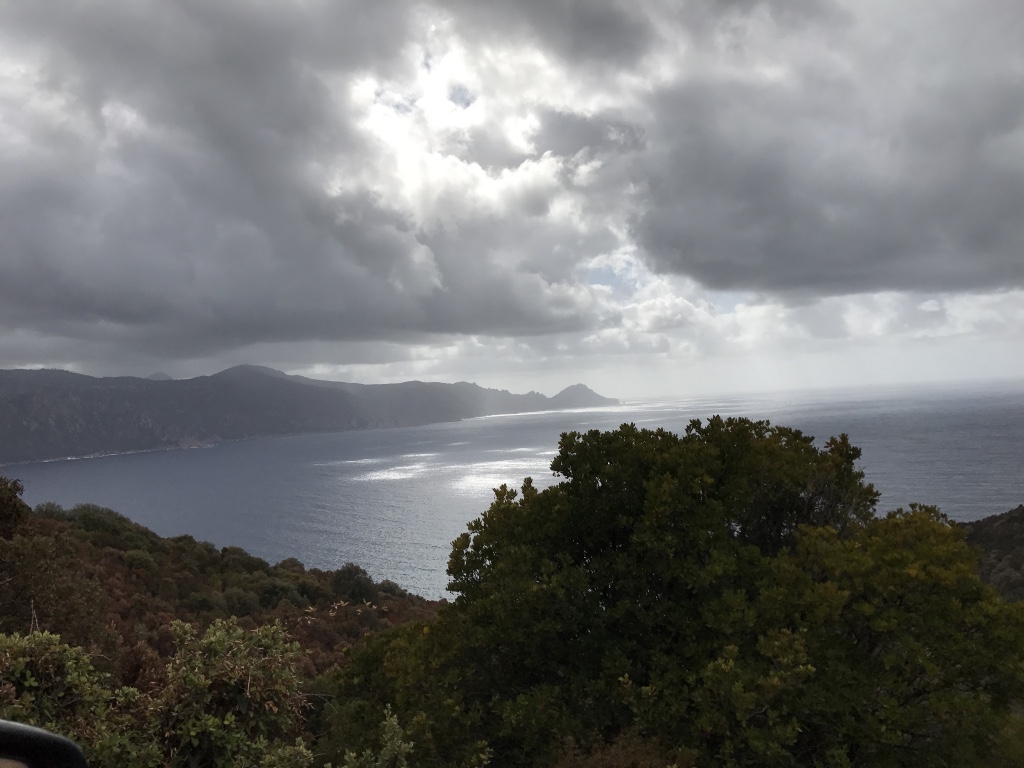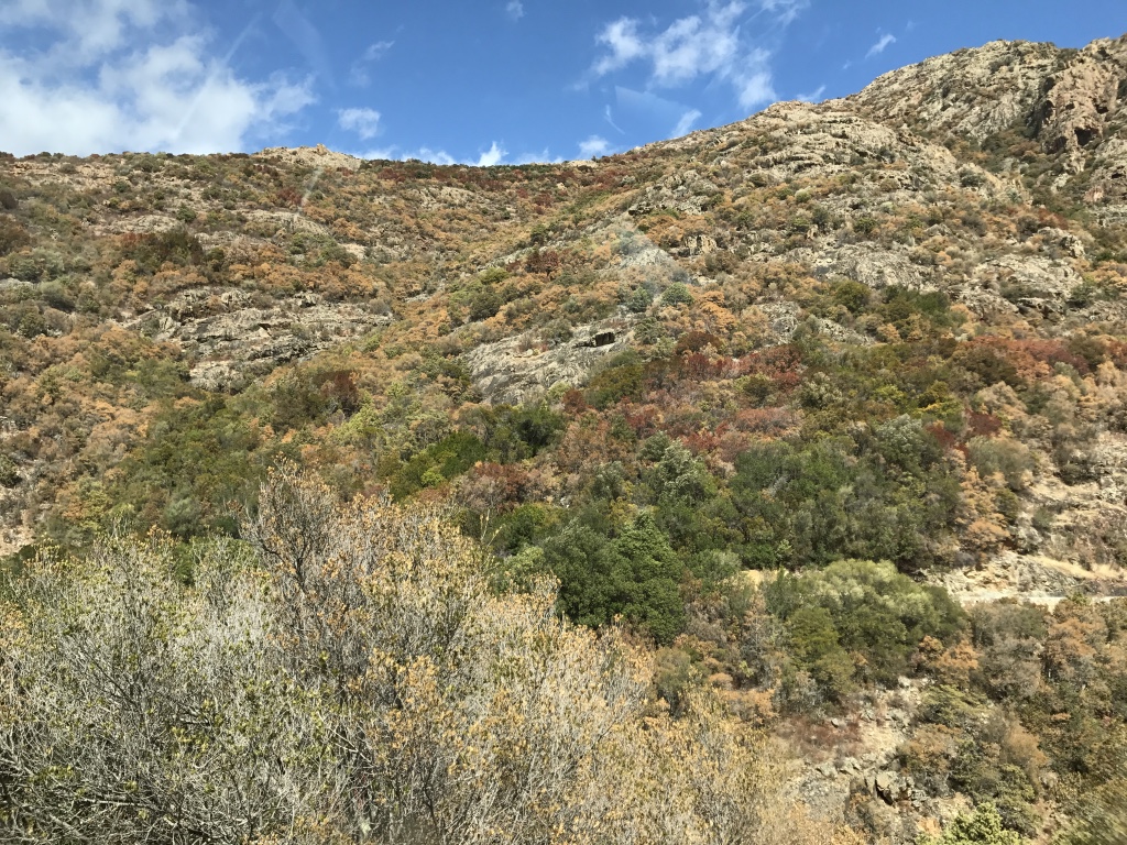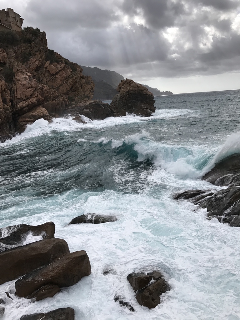 Het water was lekker ruig en daar een paar mooie foto’s van gemaakt. Aan de haven geluncht en wat rond gelopen en daarna weer de kustlijn verder gevolgd via Calenzana, Galéria, Osani, Curzo, Pattinello naar Porto. Dat was het mooiste dorp dat we hebben gezien. Het schiereiland Scandola behoort tot de World Heritage Site van Unesco Werelderfgoed. Deze prachtige rotsmassa ligt tussen de Golfe de Galeria en de Golfe de Girolata in. De prachtige rode kliffen, grotten en de bijzondere flora en fauna zijn uitzonderlijk. Alles was hier al getooid in de schitterende kleuren van de Indian Summer.