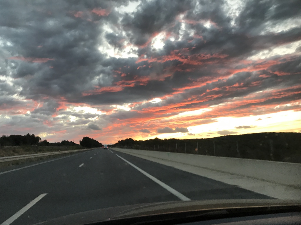 Om 5 uur liep de wekker af en wij snel gedoucht en vertrokken. Ze hadden voor ons een yoghurtje in de koelkast gezet. Nog wat cruesli in een zakje gedaan en dat hebben we later op de boot op zitten eten. Gisterenavond had Alexandra nog een berichtje gekregen van de veerdienst dat we niet naar Nice zouden varen maar naar Savona in Italië. In eerste instantie werd aangegeven dat het vanwege het weer was maar later was het vanwege omstandigheden. Dat kon dus van alles zijn. We waren er niet blij mee want daarvandaan was het toch altijd nog een paar uur rijden voor we in Nice waren. Het inschepen duurde heel lang en was behoorlijk ongeorganiseerd. We hebben lekker in de lounge op een sofa gezeten en onze voetjes op een stoel. Ik heb zitten suffen want had behoorlijk last van mijn ménière. Balen eigenlijk wel tot de conclusie gekomen dat Antarctica dan geen optie voor mij is. Ik ben op dit moment ook wel absurd moe, is na het duiken nog niet echt goed gekomen, maar toch. Moet er niet aan denken om straks 10 dagen op ruwe zee op een boot te zitten. Bovendien gaat Amber mee en dat is ook een ménière klant. Nog maar eens goed over nadenken, er zijn nog zoveel leuke dingen te bezoeken. Aan boord viel het ons wel op dat er ontzettend veel honden waren. Van Lotte heb je geen last en de andere honden vielen ook wel mee al waren er een paar kanjers bij die af en toe wel van zich lieten horen. Tijdens de autorit van Savona naar Nice zagen we overigens wel wat een ontzettend noodweer het op zee was. Heel ruw en regen. Waar wij reden was het droog. Een rare gewaarwording. Het was warm toen we door Italië reden. Nog 33 gaden gemeten dus je hoort ons niet klagen. Toen we bij Alexandra thuiswaren, alles overgeladen, toiletje bezocht en hup verder naar huis. In 4 uur en een kwartier stond ik thuis. Viel overal heel erg mee met het verkeer en tussen Montpellier en Lunas nog een schitterende lucht gezien en daar een paar foto’s van gemaakt. De hemel leek wel in brand te staan. Schitterend. Huisje was weer lekker schoongemaakt. Alles gewassen en gestreken ! ik kan er weer tegen. Nu een paar dagen rust nemen en hopelijk gaat die vermoeidheid een beetje over. Was een heel leuke ontspannen vakantie met toch wel als hoogtepunt de parachutesprong !
