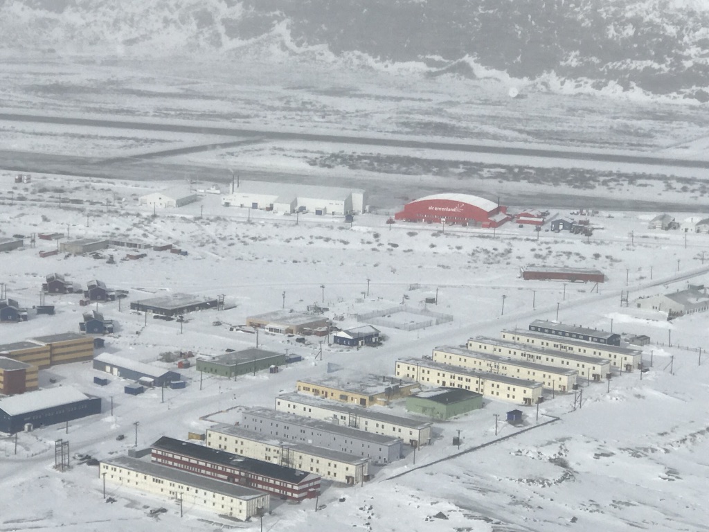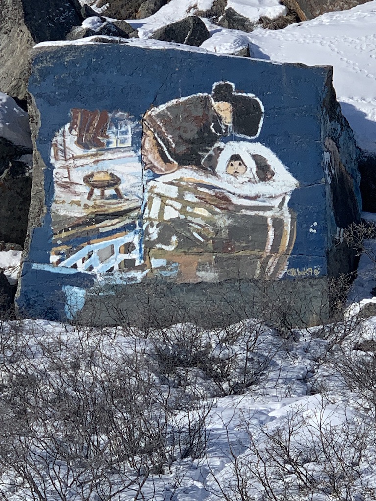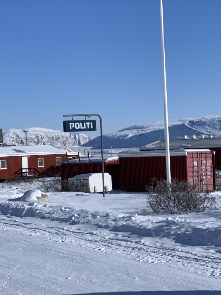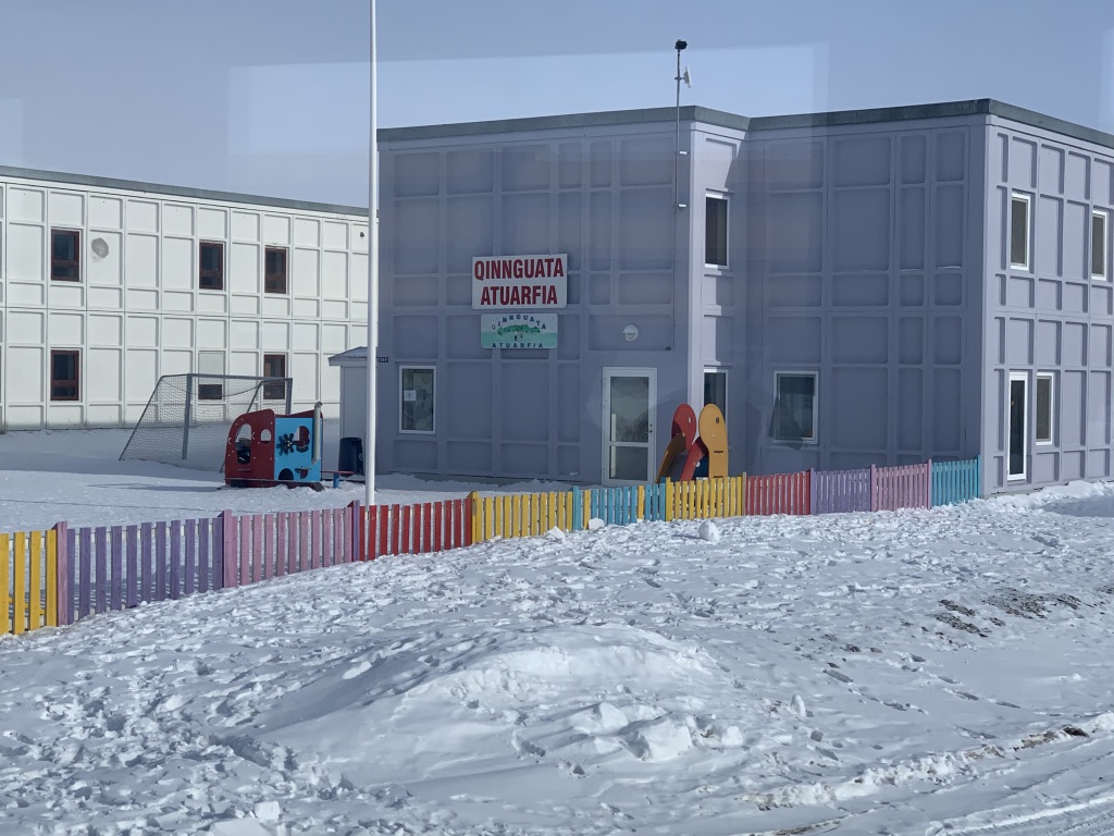 Ietsje verderop ligt het kerkhofje. Met recht ‘tje’. Tot nu toe zijn er 3 mensen begraven. Iedereen die hier komt is import en gaat na zijn werkzame leven weer terug naar de plaats waar hij vandaan kwam. Geeft wel aan dat de binding met deze streek niet erg groot is. De laatste die hier is begraven is een 30 jarige Deense die ruim tien jaar onderwijzeres in Kangerlussuaq is geweest. Toen ze kanker kreeg is ze terug gegaan naar Denemarken voor verdere behandeling maar wilde hier begraven worden. Zij was een zeer geliefd persoon.