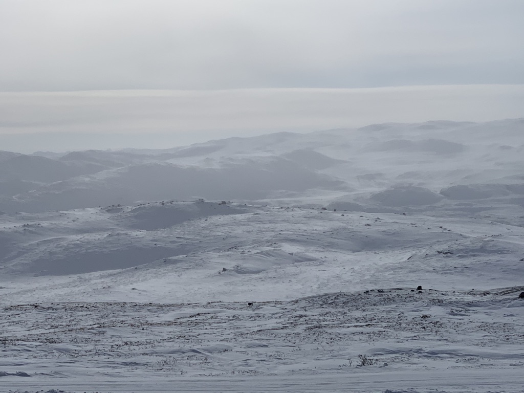 De muskusossen hebben we in ieder geval niet gezien al zouden die hier wel moeten rondlopen. Gisterenavond stond die op het menu. Was klaargemaakt als gehakt en smaakte prima. De foto van de muskusos is van internet gepikt.