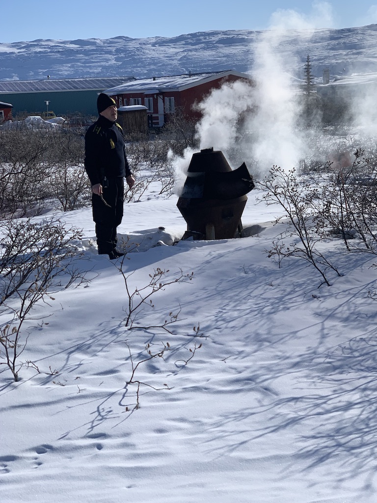 De politieman was in een grote bak iets aan het verbranden en natuurlijk moesten we weten wat hij aan het doen was.