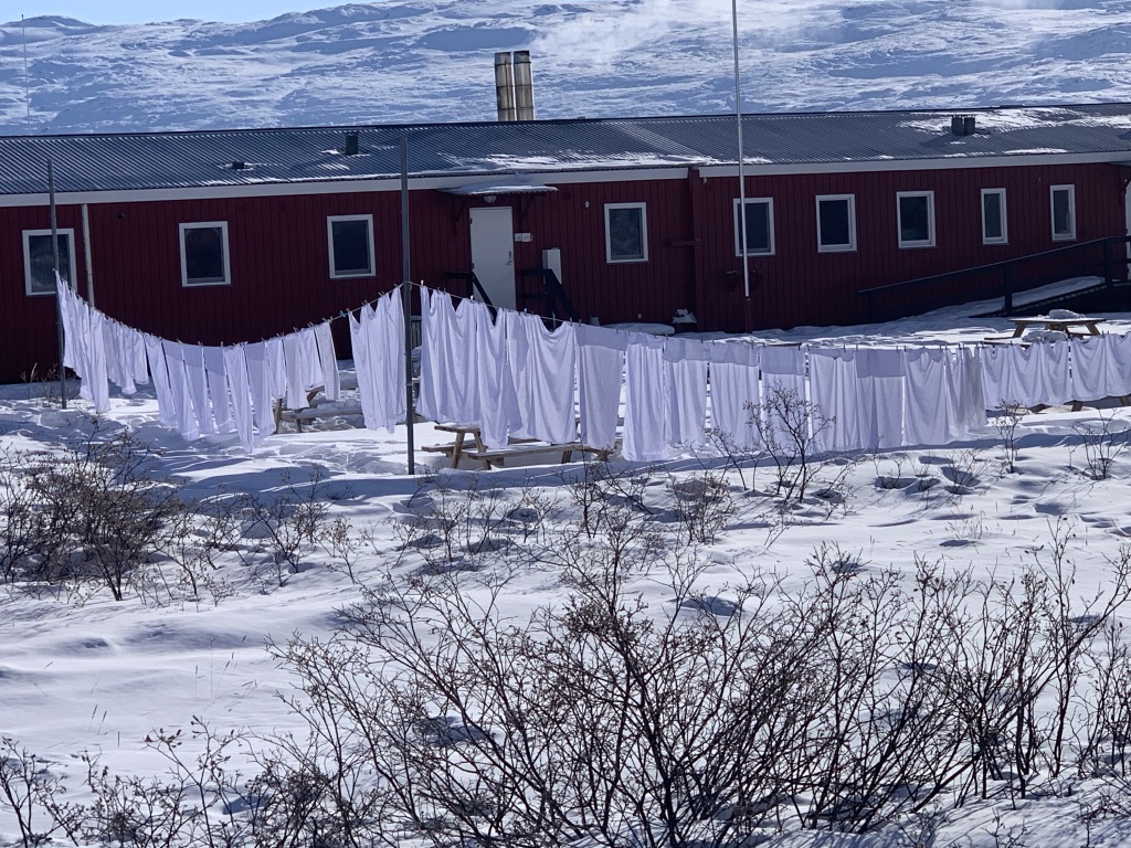 Het was een onrustige nacht. Er was vandaag een groep Amerikanen aangekomen en die moesten ontzettend vaak naar het toilet. Zij gaan hier jagen en willen één muskusos schieten. Nemen het gewei en het vel mee en het vlees is voor de plaatselijke bevolking. Aan hun uitrusting te zien hoeven ze niet op een dubbeltje te kijken.