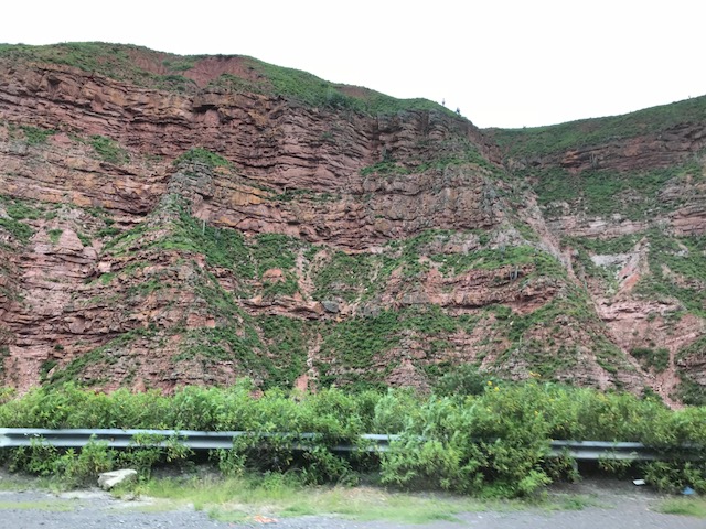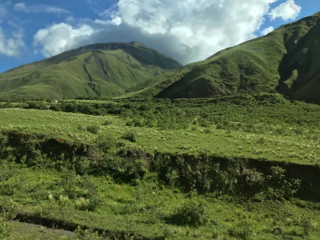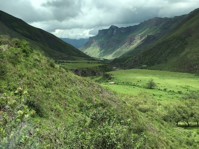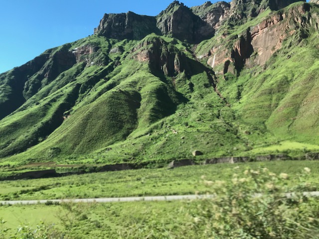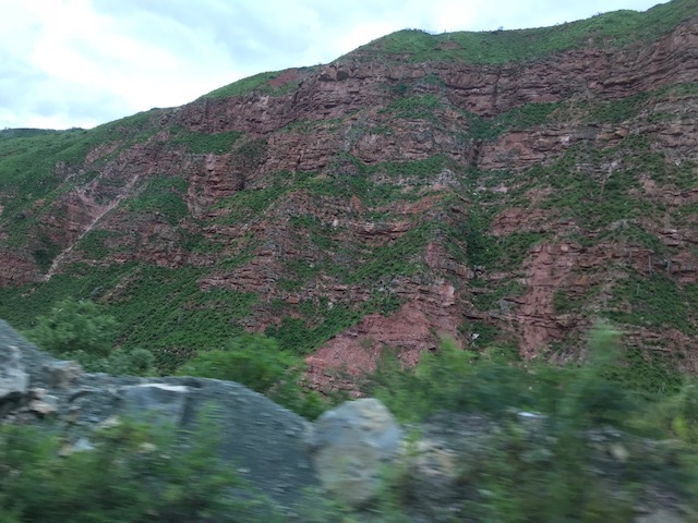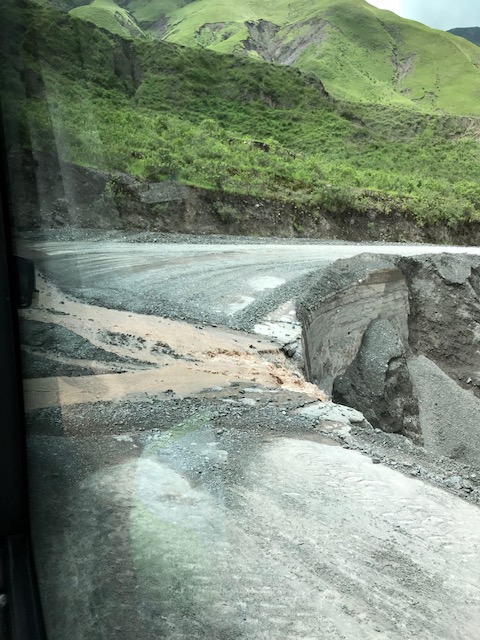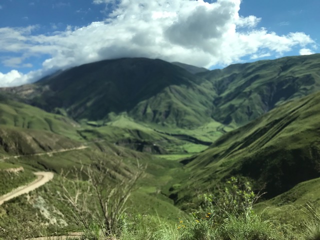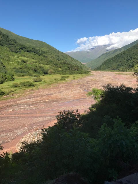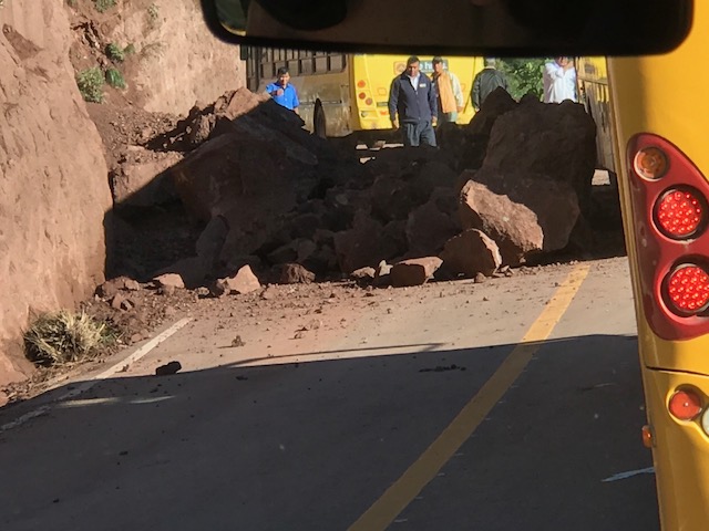Weer vroeg mijn bed uit en weer prachtig weer. Ik had dat niet verwacht want vannacht is het noodweer geweest. Onweer en een wolkbreuk. Toen ik op een uur of 3 naar buiten keek was er geen straat te zien en hadden we een rivier voor de deur. Ik ben moe en eigenlijk val ik al snel in slaap en word wakker als Pablo een gil geeft. Op een smalle weg door de bergen is een stuk rots naar beneden gekomen en heeft een bus geraakt. De weg is nu versperd. Gelukkig zijn er 3 bussen en met man en macht lukt het ze om een paar stukken te verplaatsen en de bus weer vrij van rotsblokken te krijgen en dan kunnen we er langs. Schijnt vaker te gebeuren maar ook Pablo had het nog nooit zien gebeuren. Hij is er toch een beetje door aangeslagen.