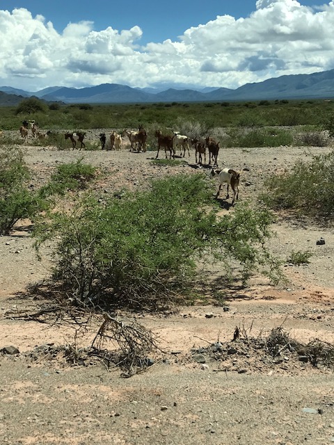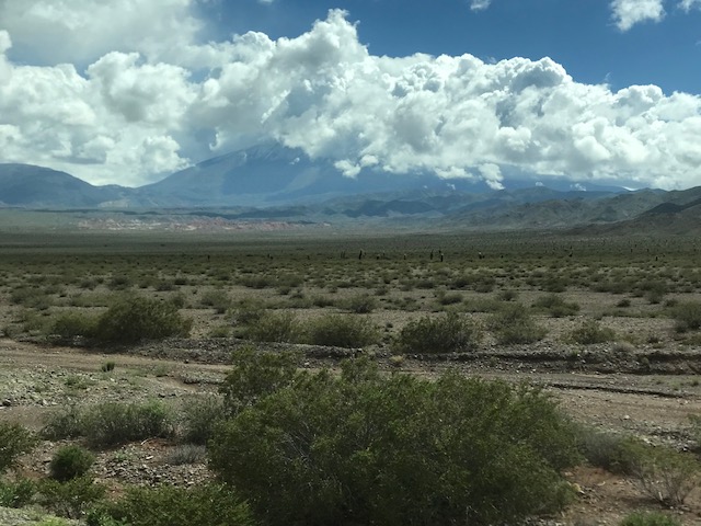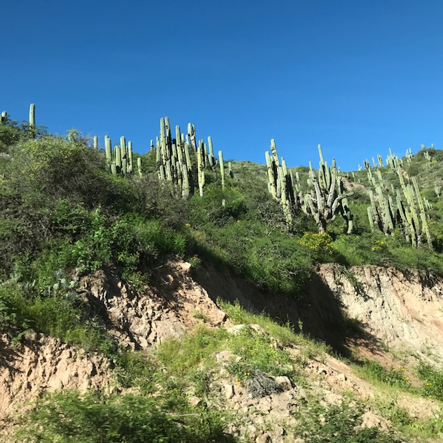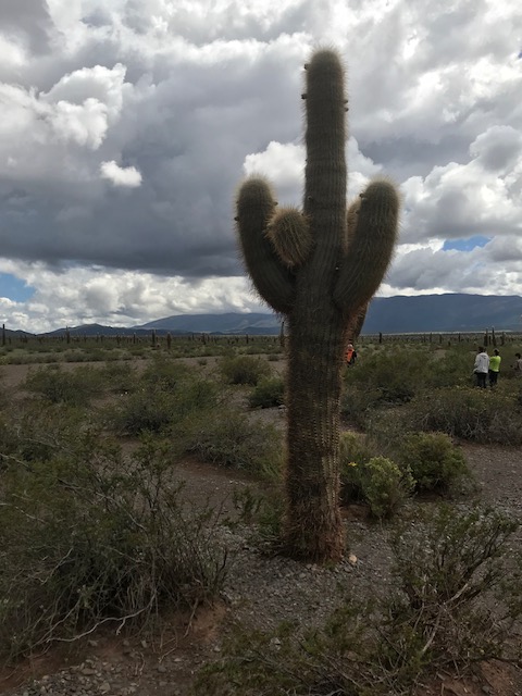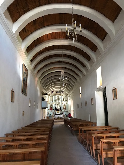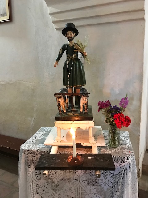 Rond 12 uur bereiken we Cachi en besluiten eerst wat te gaan eten. Pablo zal een leuk tentje uitzoeken en ik wil eerst naar de kerk. Zou het hier dan gaan lukken om een kaars aan te steken. Maar nee hoor, ook hier geen kaarsen. Het is een klein, smal kerkje en ik ga vooraan zitten om even alles in me op nemen om daarna richting het altaar te lopen en wat foto’s te nemen. Ik word dan aangesproken door een oudere heer die iets vraagt en ik vraag hem of hij Engels spreekt. Een beetje krijg ik als antwoord maar met handen en voeten kan ik hem toch vertellen dat ik het jammer vind dat het niet mogelijk is om een kaarsje aan te steken voor die vrienden die dat nodig hebben. Hij beduidt me om even te wachten en verdwijnt achterin de kerk en komt terug met een kaarsje. Dat heeft al eerder gebrand maar dat maakt niets uit. Hij vraagt waar ik het wil hebben en wijst naar een beeldje van een persoon hier uit de streek (heb ik later begrepen) met wat takjes in zijn hand met daarvoor een paar ossen. Hij vertelt dat het de patron van Madrid is. Waarom dat hier staat ? Geen idee begrijp zijn uitleg niet maar wel dat het te maken heeft met een goede oogst. Zoiets als bid- of dankdag voor het gewas denk ik. Hij haalt een plankje en daar mag ik mijn kaarsje zetten. En zo heb ik het toch voor elkaar gekregen om een kaarsje aan te steken voor al die vrienden en vriendinnen die het heel goed kunnen gebruiken. Dit moet geluk brengen.