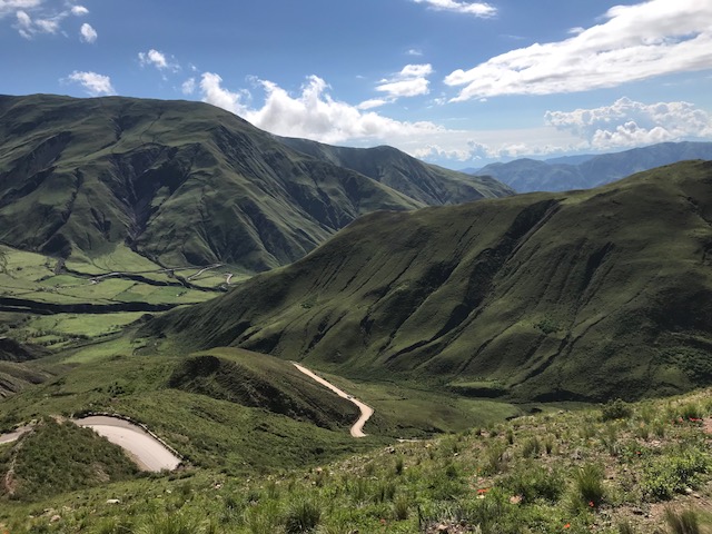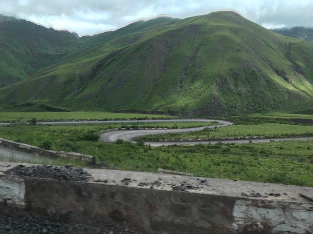 Daarna gaan we een hapje eten. Ik heb geen honger maar besluit een salade te nemen en een glas rode wijn. De terugweg is spectaculair. Het is intussen zacht gaan regenen en de grindweg is glad. Je ziet steeds auto’s en bussen slippen. Ook wij doen dat een paar keer. Volgens Pablo heeft deze weg de bijnaam: weg naar de hel. Kan me er wel iets bij voorstellen.