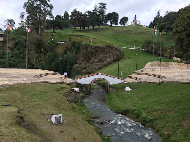 Na een uurtje zijn we gestopt om de plek waar ooit onder leiding van Simon Bolivar de, Francisco de Paula Santander en José Antonio Anzoátegui samen met het Engelse huurleger de Spanjaarden werden verslagen te gaan bezoeken. Dat was op 7 augustus 1819. Het zijn twee hele grote pleinen die met een klein bruggetje zijn verbonden. Deze gebeurtenis staat bekend als de slag van Boyacá. Dit was tevens het laatste wapenfeit nadat officieel een Onafhankelijk Colombia uitgroepen zou worden. Dit feit wordt ieder jaar nog in Colombia gevierd.