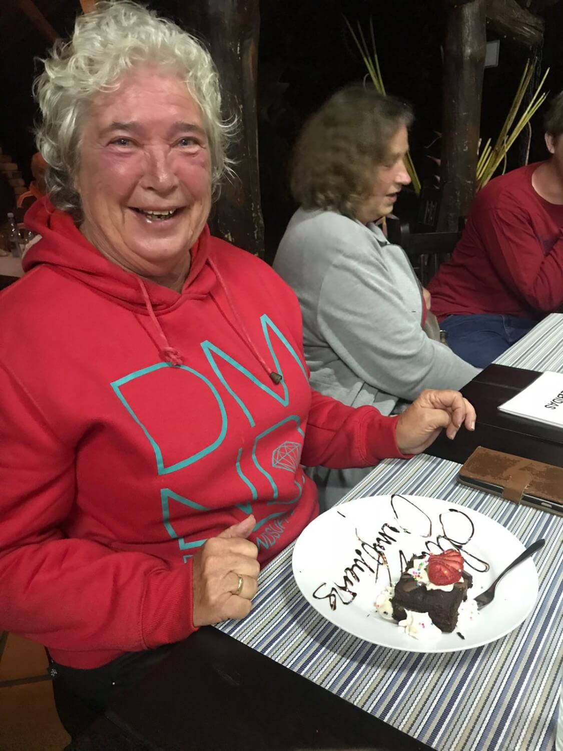 Was wel grappig. Eten was heerlijk. Toen weer terug naar het hotel en daar ben ik een paar uurtjes mijn bed in gedoken. Voelde me grieperig en vooral pijn in mijn keel. Toch nog wat gaan eten en toen werd het nog gezellig. We waren al klaar met eten en toen bood ik met metgezellen een rondje aan. Waarop de ober vroeg: allemaal op uw kamer ? Ik zei toen Ja dat is wel de bedoeling want ik ben jarig. Toen moest er natuurlijk gezongen worden en ook de andere tafels zongen luidkeels mee.