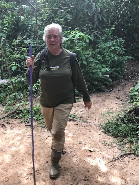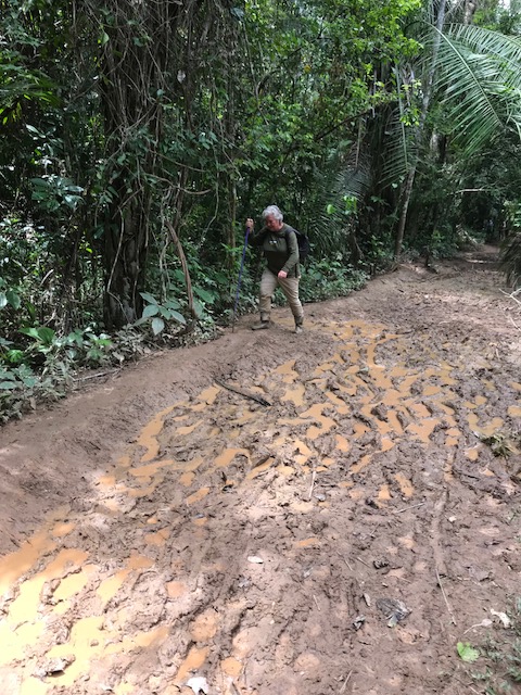 Ook veel papegaaien, aapjes en onwijs veel vogels. De een nog mooier dan de ander. Na een paar uur op het meer en dan vooral langs het oerwoud te hebben gevaren gaan we weer terug. Op de terugweg heb ik het erg moeilijk. Het is een andere, kortere weg maar veel slechter en zwaarder. De plassen zijn soms zo diep dat mijn laarzen vollopen. Dat komt ook omdat ik van die dikke kuiten heb en de randen omgeslagen moesten worden anders pasten ze niet, dus zijn mijn laarzen korter. Ik zit een paar keer vast en ook blijven mij laarzen soms steken in de modder. Dan moet ik die weer zoeken en proberen een hoger gelegen gedeelte te bereiken. Mijn laarzen leeg te gieten en proberen ze weer aan te krijgen. Soms probeer ik me aan een boom vast te grijpen maar dan gilt Franklin dat ik dat moet laten want er kunnen giftige spinnen aan zitten. Het is afzien. Ik val een aantal keren en mijn kleding is niet om aan te zien. Eindelijk bereiken we de boot die ons naar de lodge brengt.