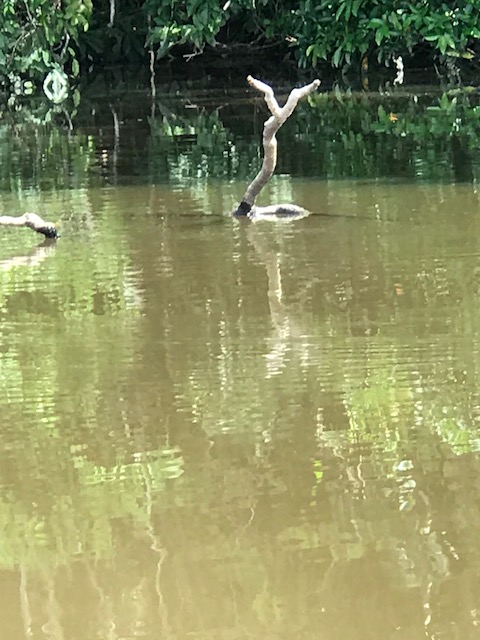We gaan op zoek naar reuzenotters en krokodillen. Die laatste zien we niet maar de otters wel.