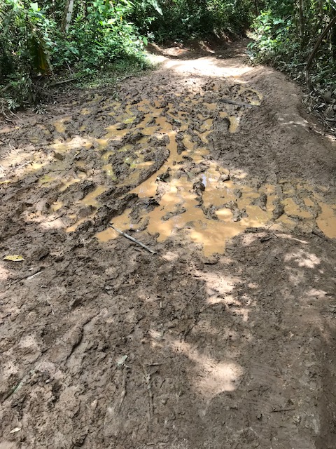 Het liefst zou ik met kleren en al de rivier in zijn gesprongen maar dat mocht niet omdat de stroming veel te sterk is. Als ik bij mijn hut ben aangekomen ben ik eigenlijk te moe om mijn laarzen uit te trekken. Krijg het toch voor elkaar en kleed me verder op de veranda uit. Zelfs mijn ondergoed zit onder de modder.