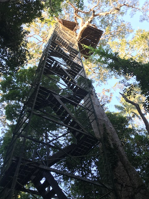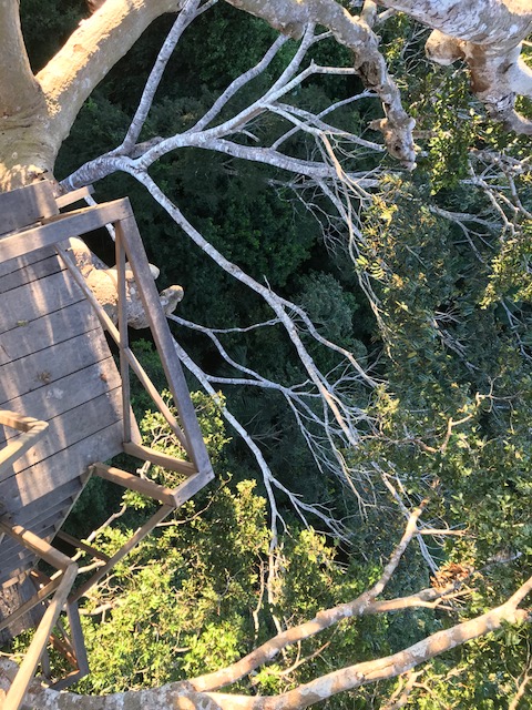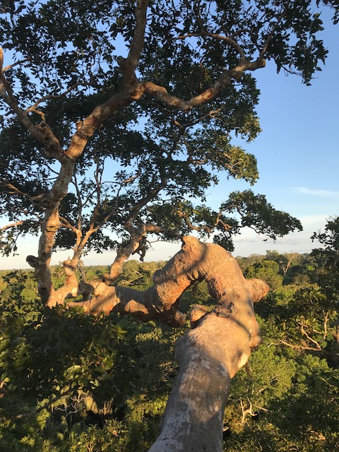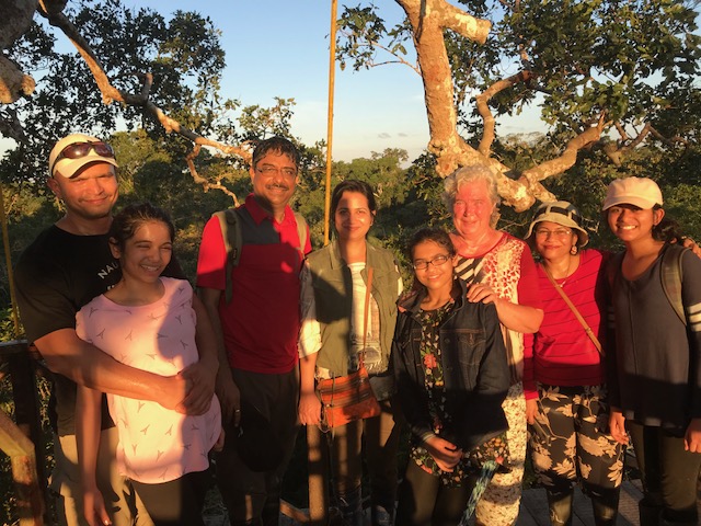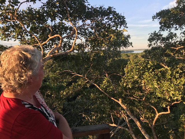 Wat is een douche dan lekker zelfs als het koud water is. Andere kleren aan en vlug een hapje gaan eten. Daarna mag ik 2 uur siësta houden. Hoera !! Dan vertrekken we naar een uitkijktoren. Ruim een half uur doen we er over. Gelukkig is het grootste deel van het pad goed bereikbaar. Als we de 150 treden hebben geklommen is het uitzicht het inderdaad wel waard geweest om hier naar toe te lopen. Vogels vliegen af en aan. De een nog mooier dan de ander en allemaal kleurrijk. Eigenlijk wil ik hier nog wel een poosje blijven maar we moeten zelfs snel zijn om voordat het donker wordt weer terug te zijn. Dit was echt echt een dag met een gouden randje.